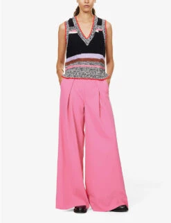- Relaxed fit, high rise, wide leg, elasticated waistband, contrasting topstitching, two side slip pockets, two back welt pockets, branded metal plaque at the back, fully lined