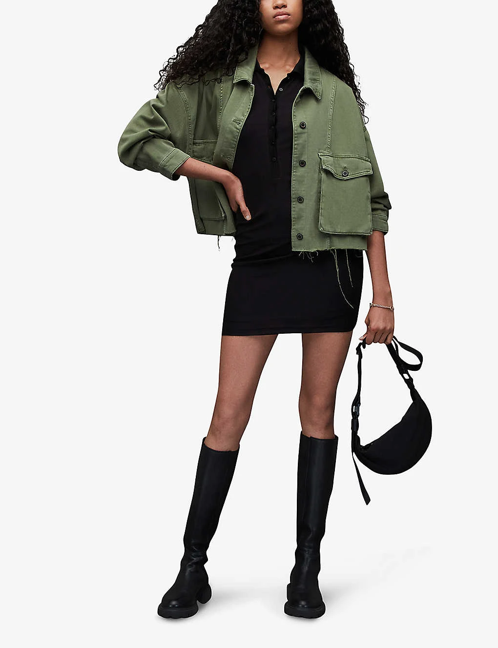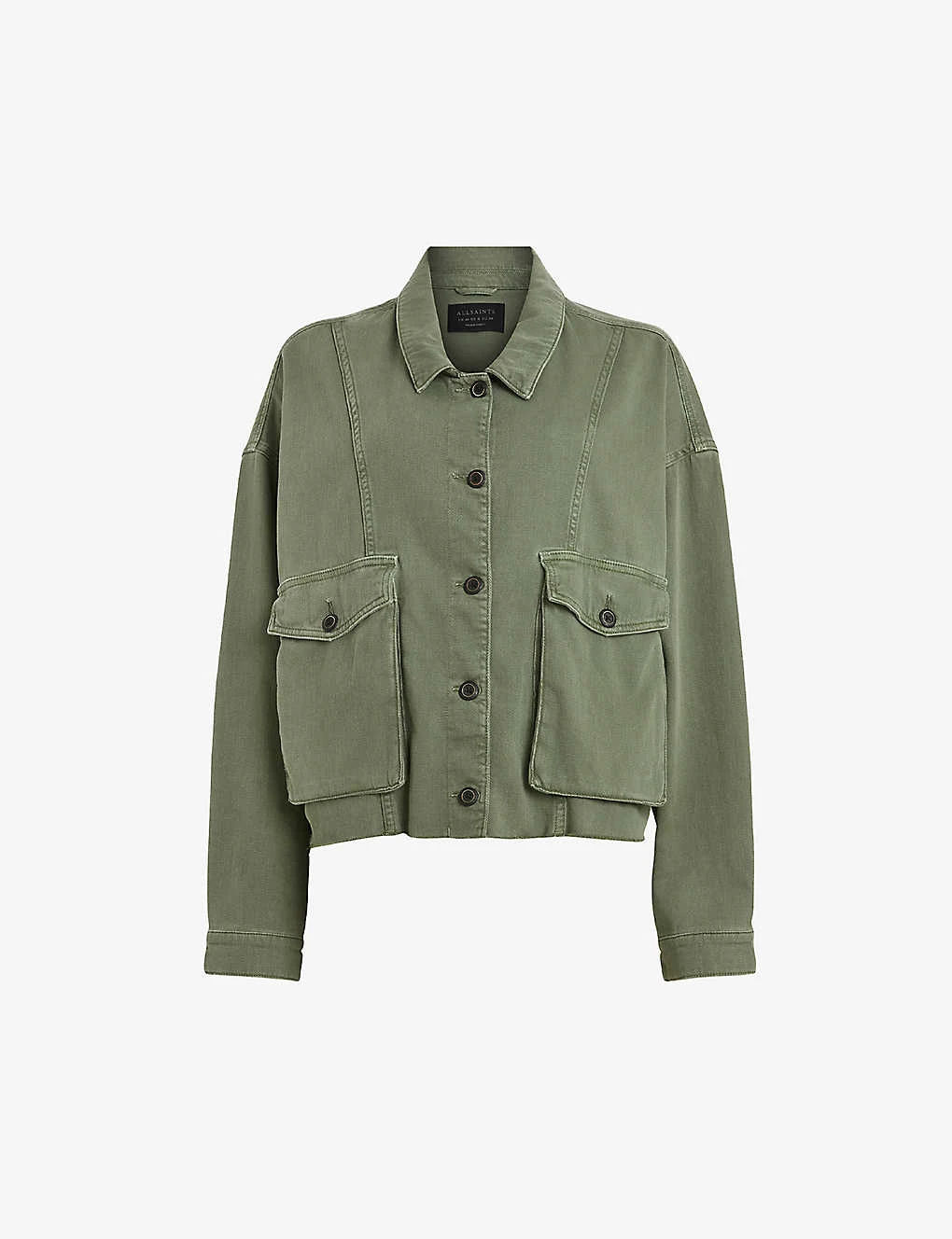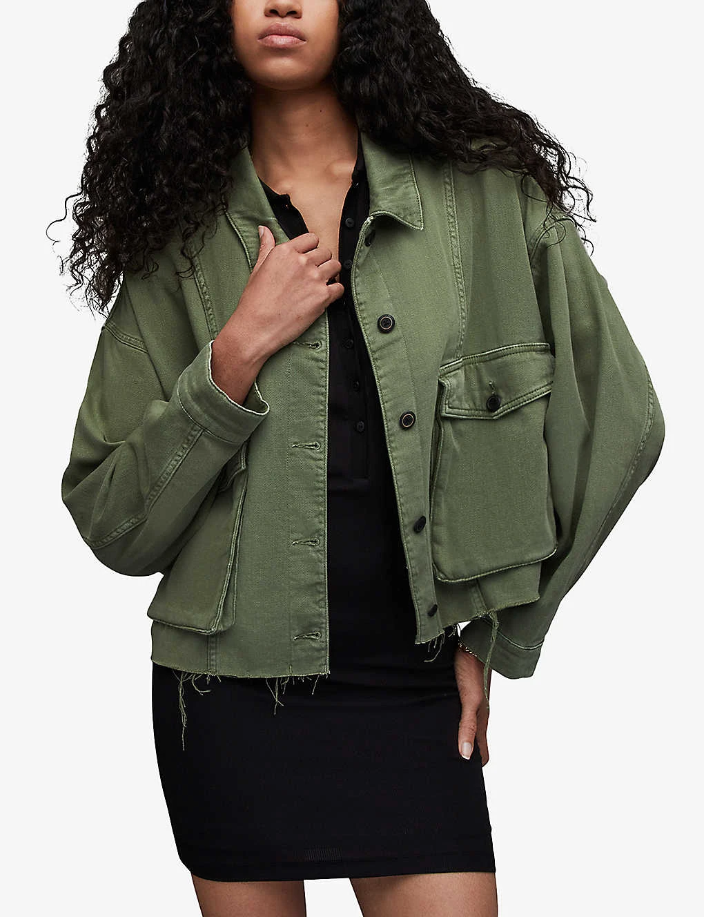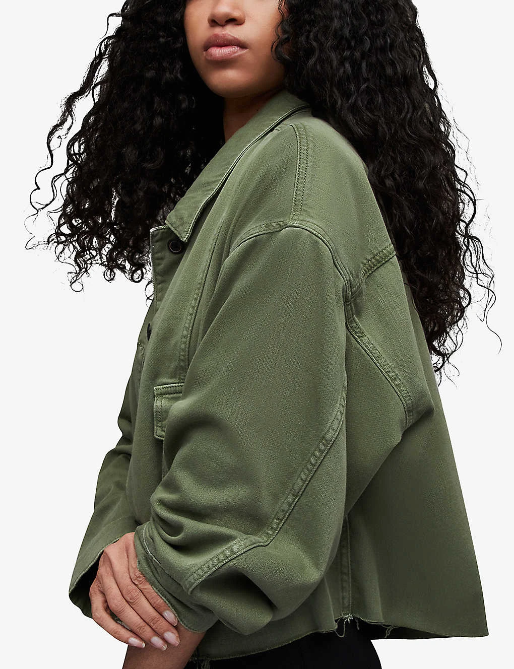 - Oversized fit, long sleeves, spread collar, frayed hems, patch pockets