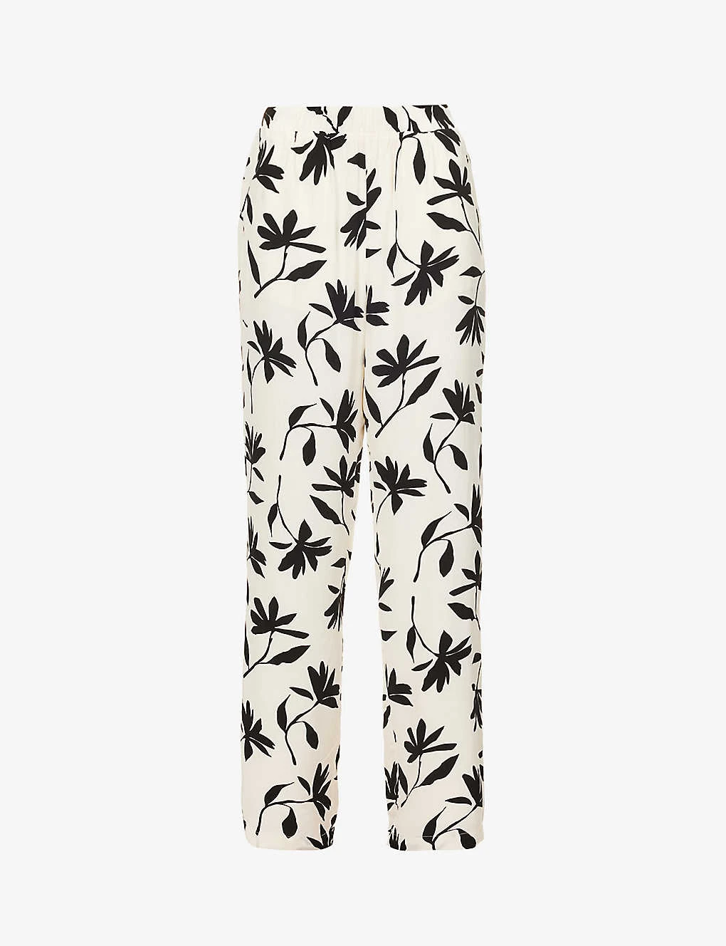 - Relaxed fit, mid-rise, wide leg, structured elasticated waistband, two slip pockets at front, all-over floral pattern