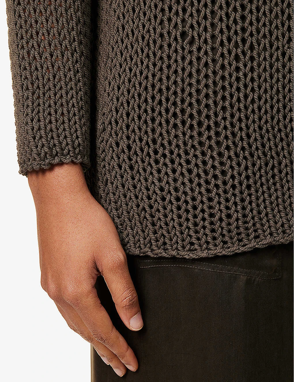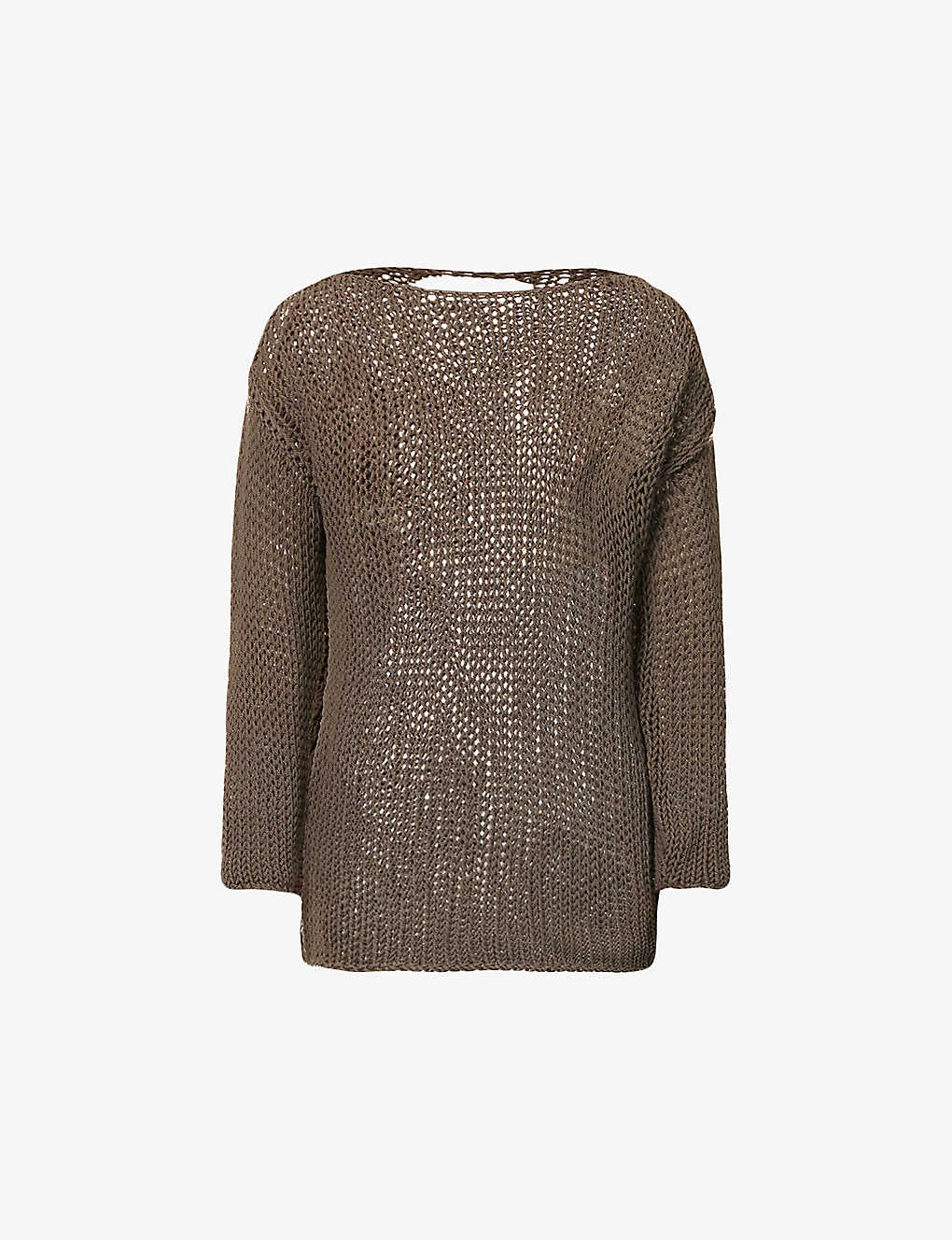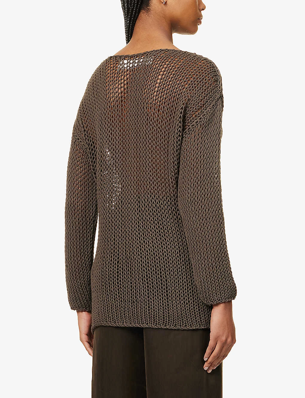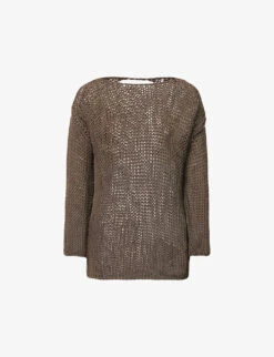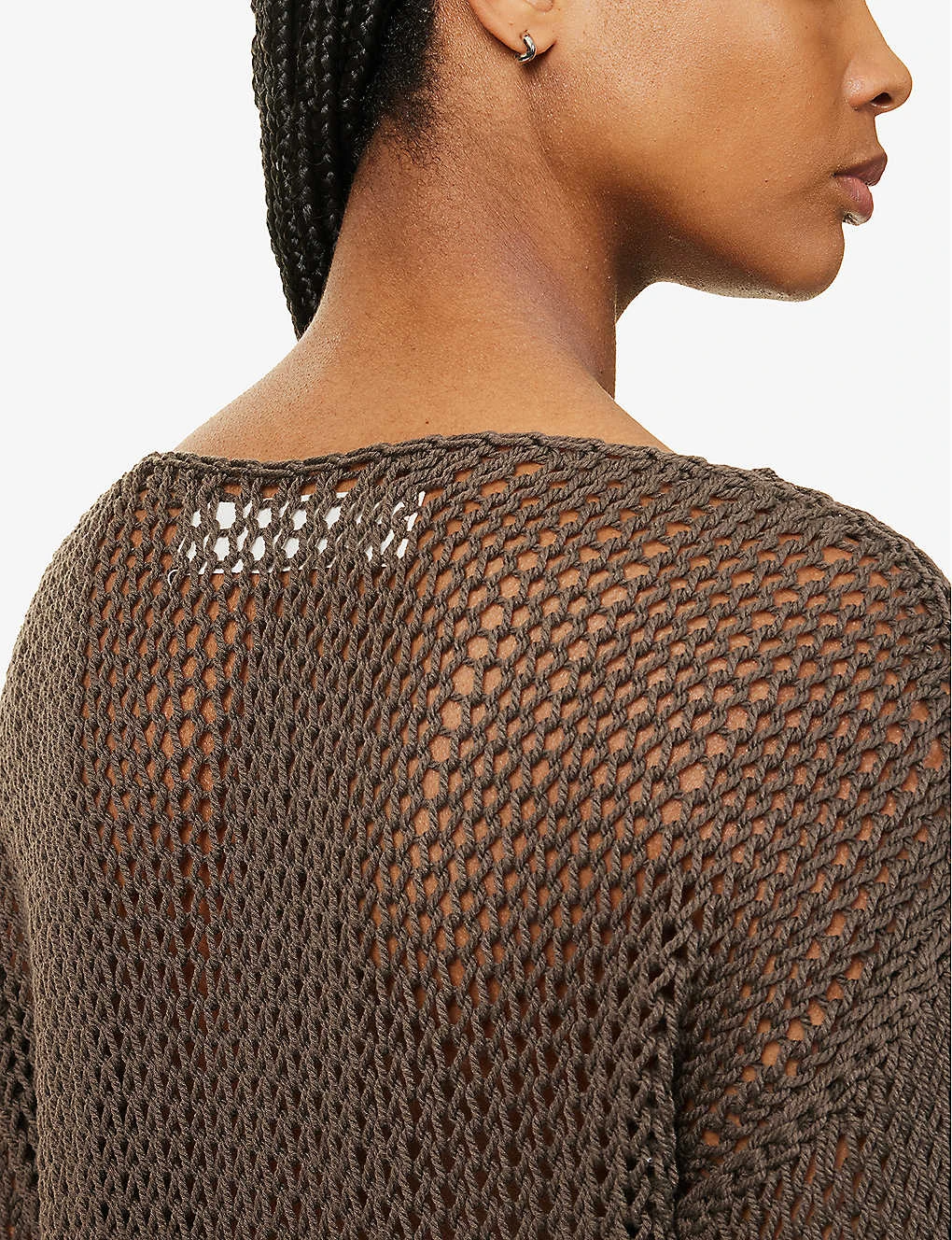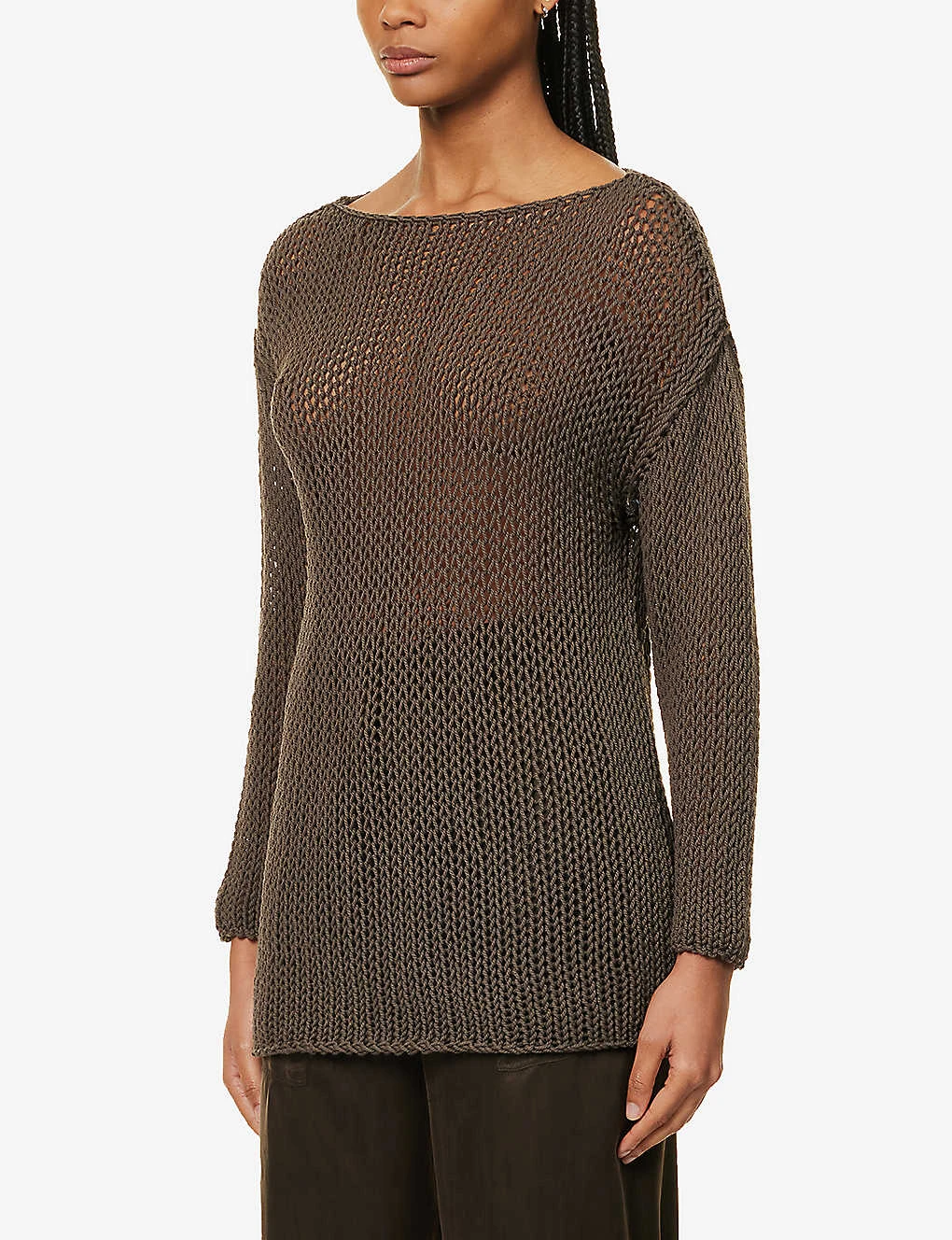 - Relaxed fit, boat neckline, long sleeves, mesh knit pattern, sheer
