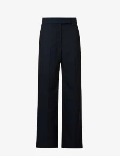 - Regular fit, mid-rise, wide leg, structured waistband with belt loops, two slip pockets at front, darts at back, two welt pockets at back, pressed centre creases