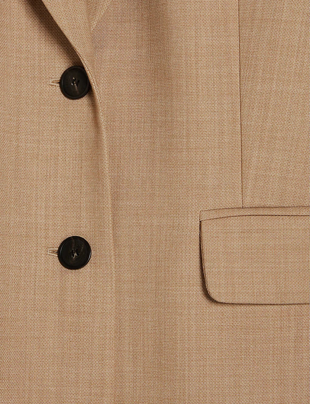 - Straight cut, long sleeves, notched lapels, single-breasted button fastening, chest welt pocket, two side flap pockets, fully lined