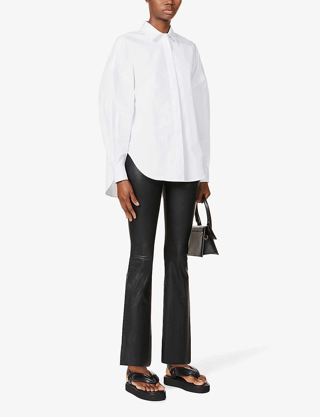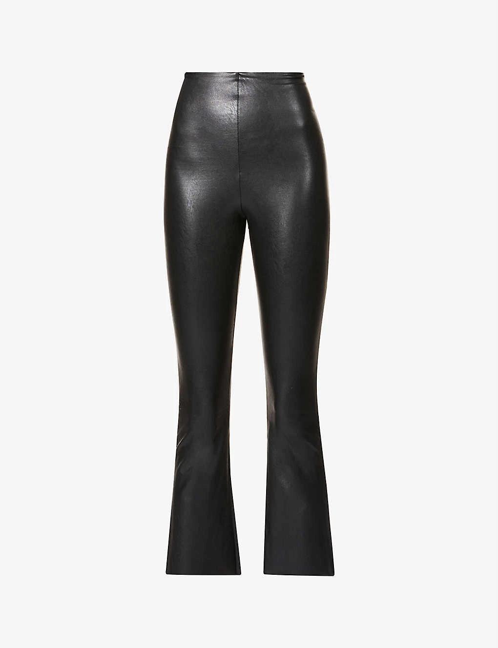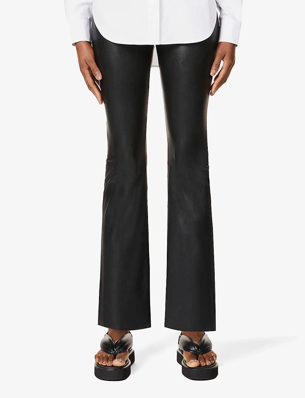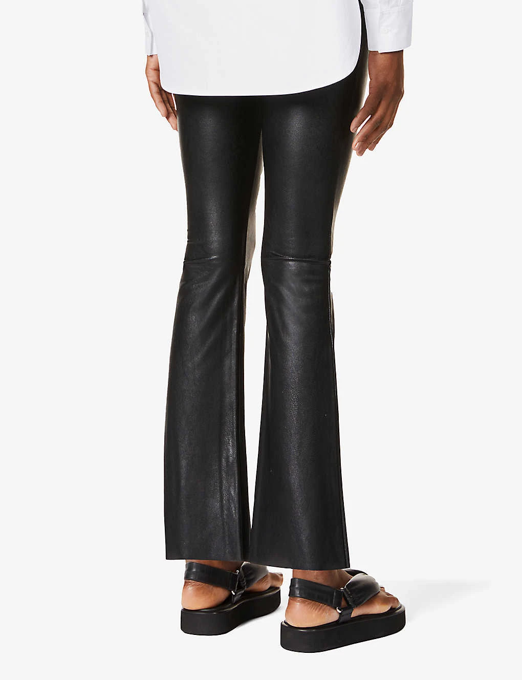 - Fitted, high rise, flared leg, sculpting waistband, four-way stretch, light compression, raw hems