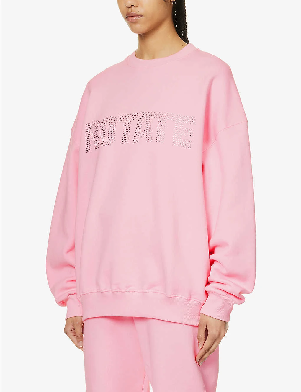 - Relaxed fit, round neck, dropped shoulders, long sleeves, brand text rhinestone design at front, ribbed trims