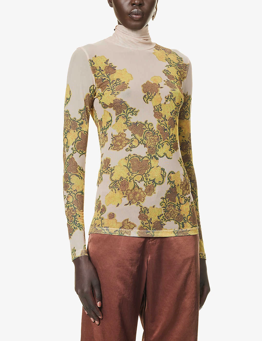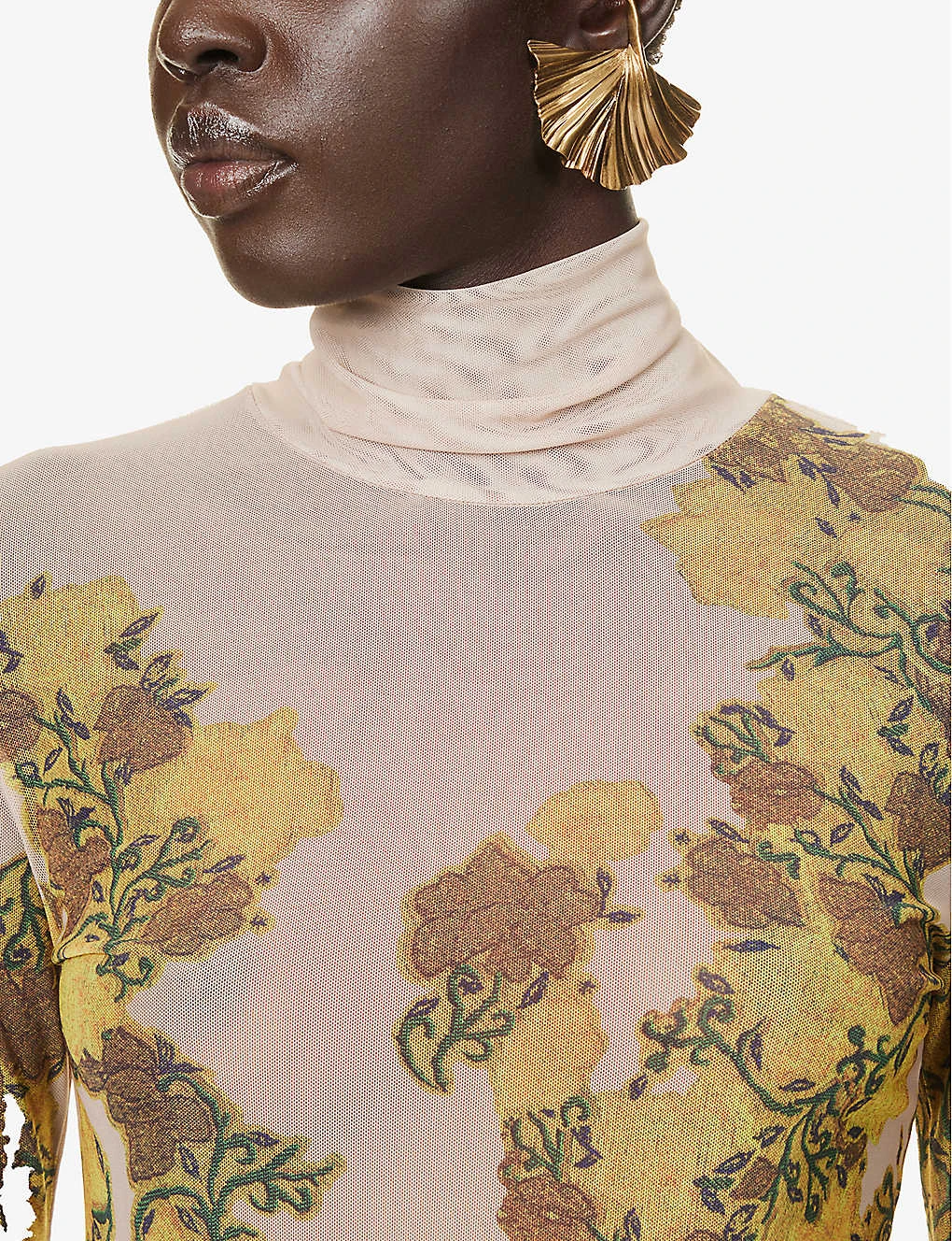 - Regular fit, high neck, long sleeves, floral pattern, sheer