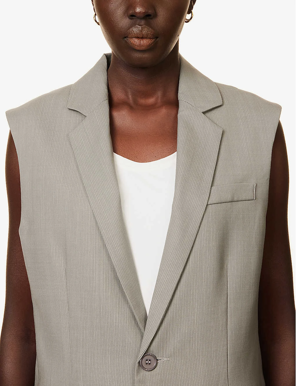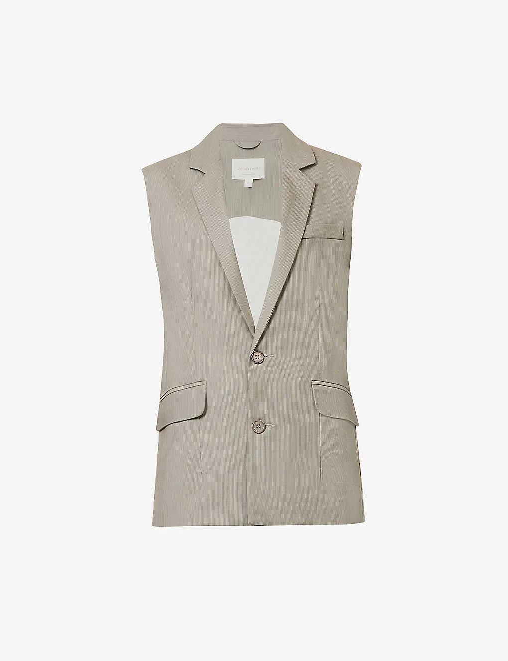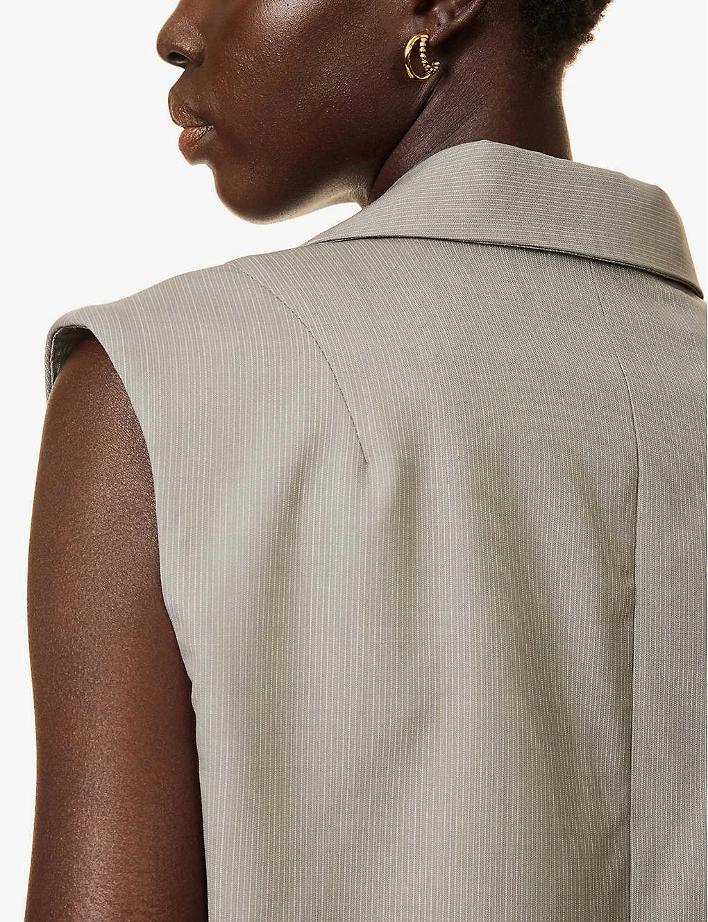 - Relaxed fit, V neck, notched lapels, sleeveless, welt pocket and two flap pockets at front, all over striped print, fully lined