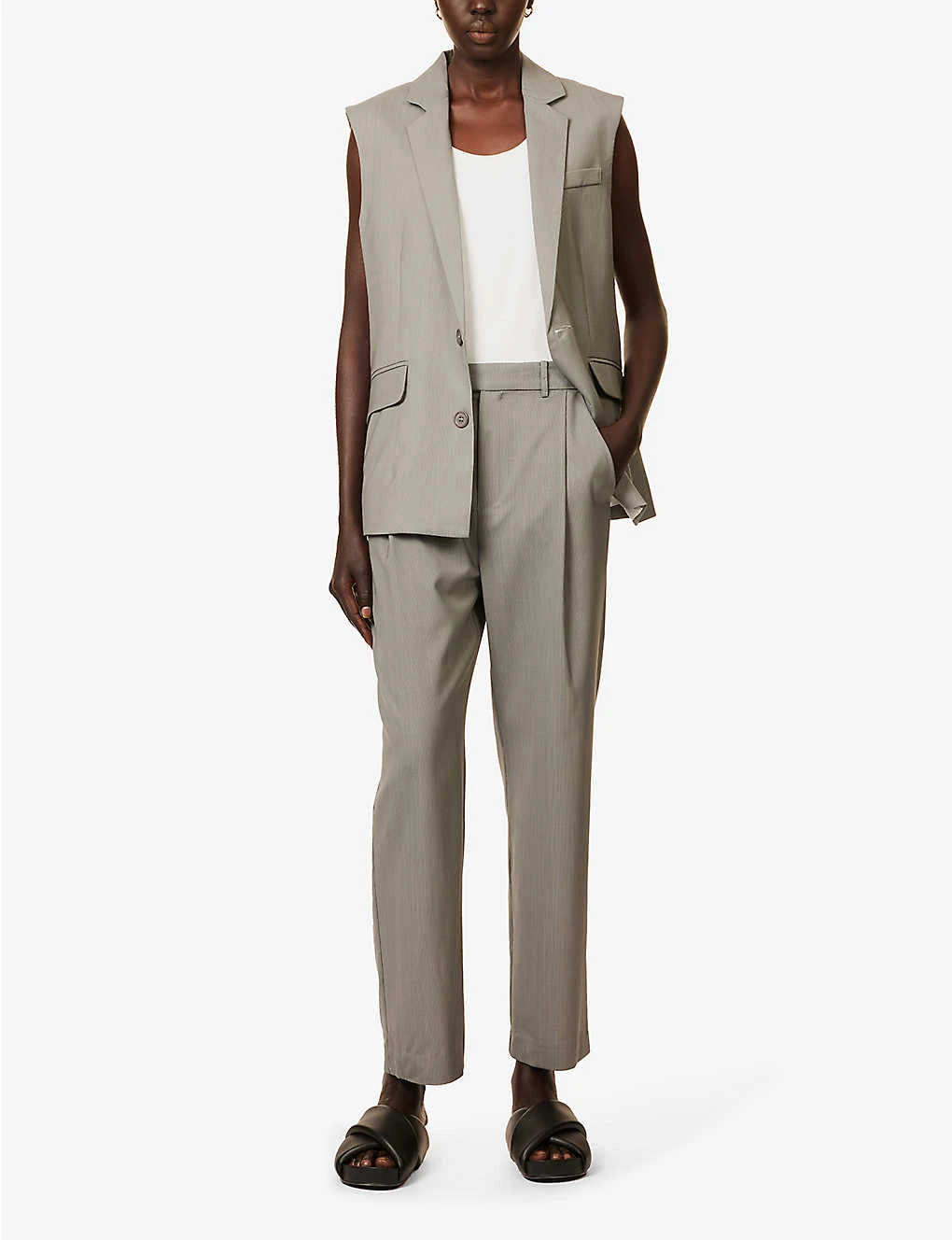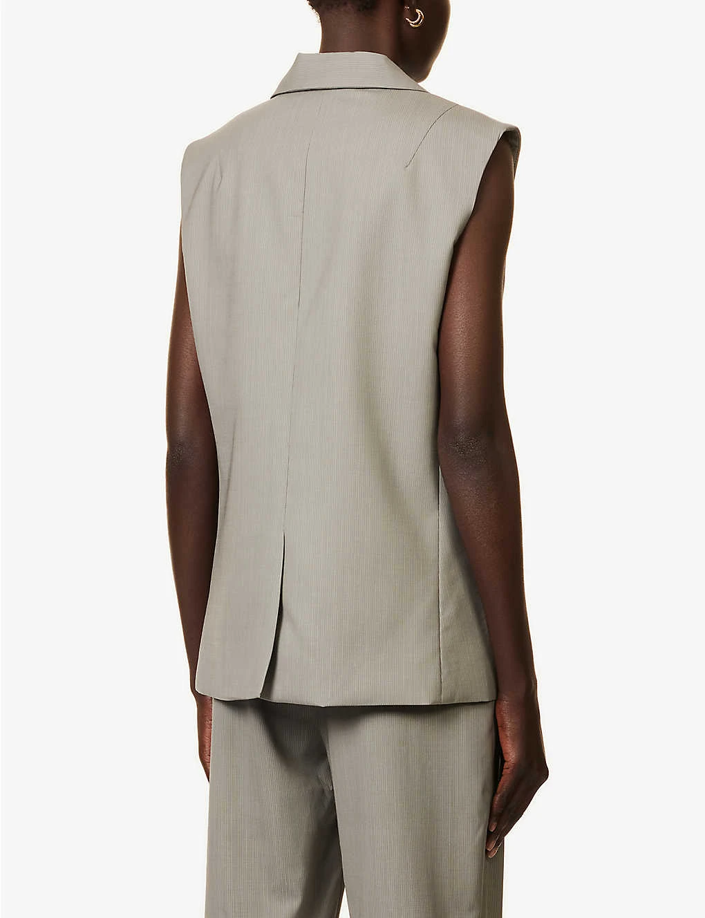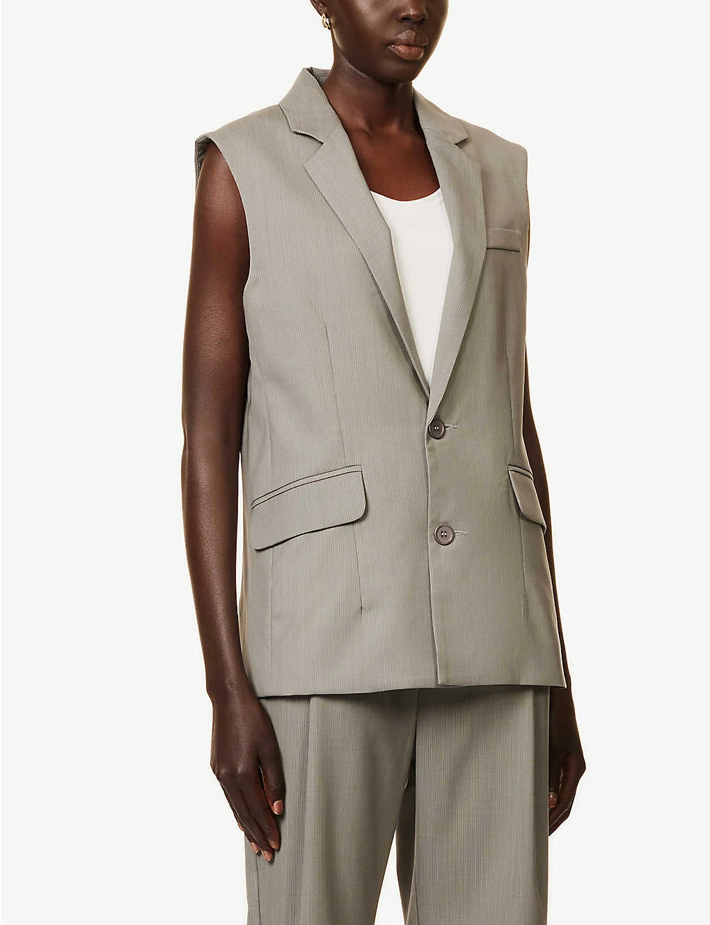 - Relaxed fit, V neck, notched lapels, sleeveless, welt pocket and two flap pockets at front, all over striped print, fully lined