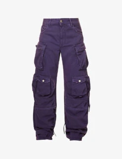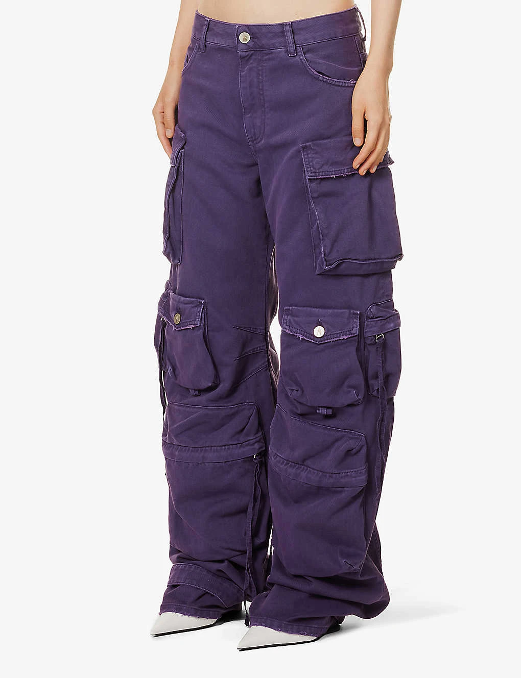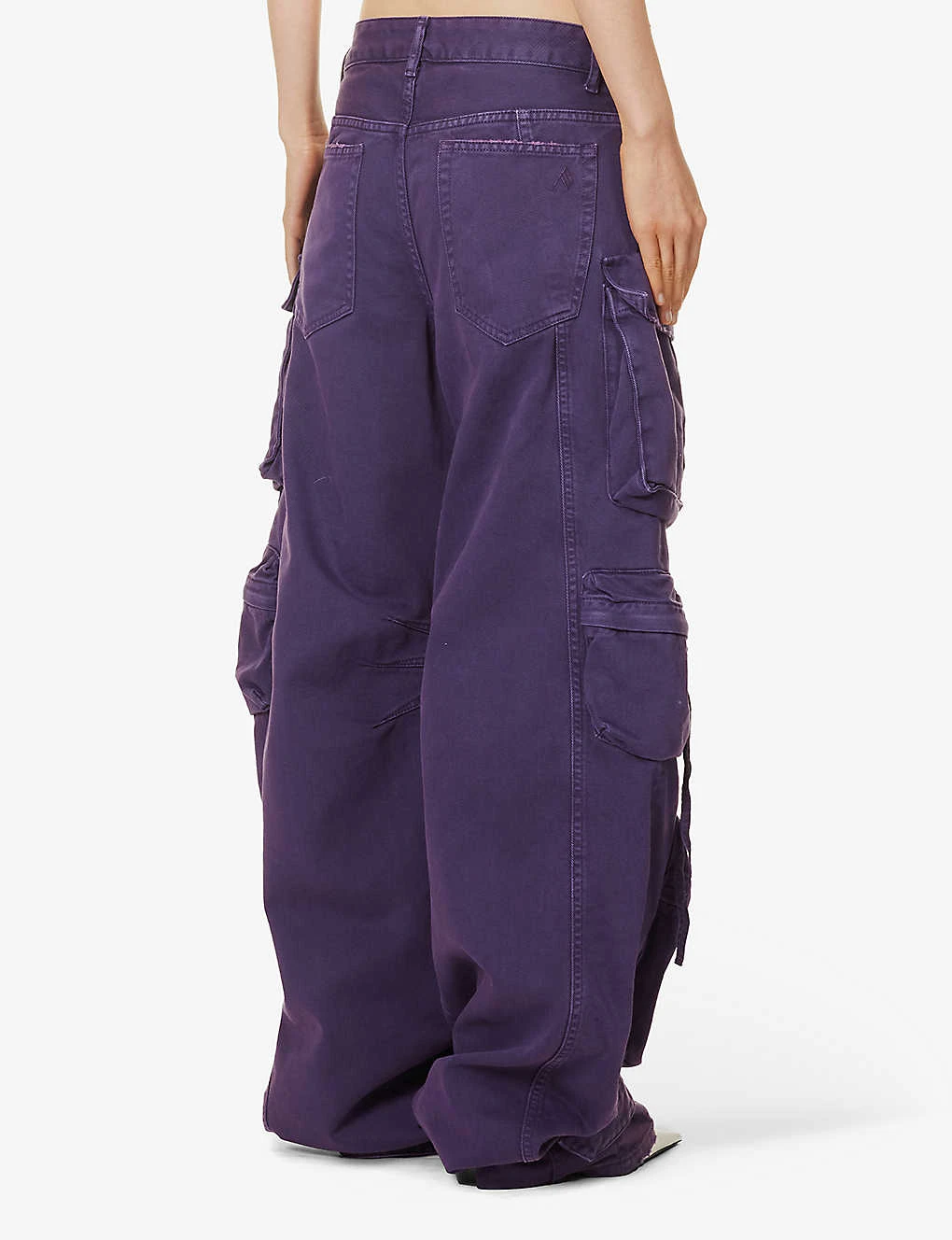 - Regular fit, mid-rise, wide leg, structured waistband with belt loops, five pockets, five flap pockets at sides, tonal brand embroidery at back, faded wash, frayed trims, branded silver-toned hardware