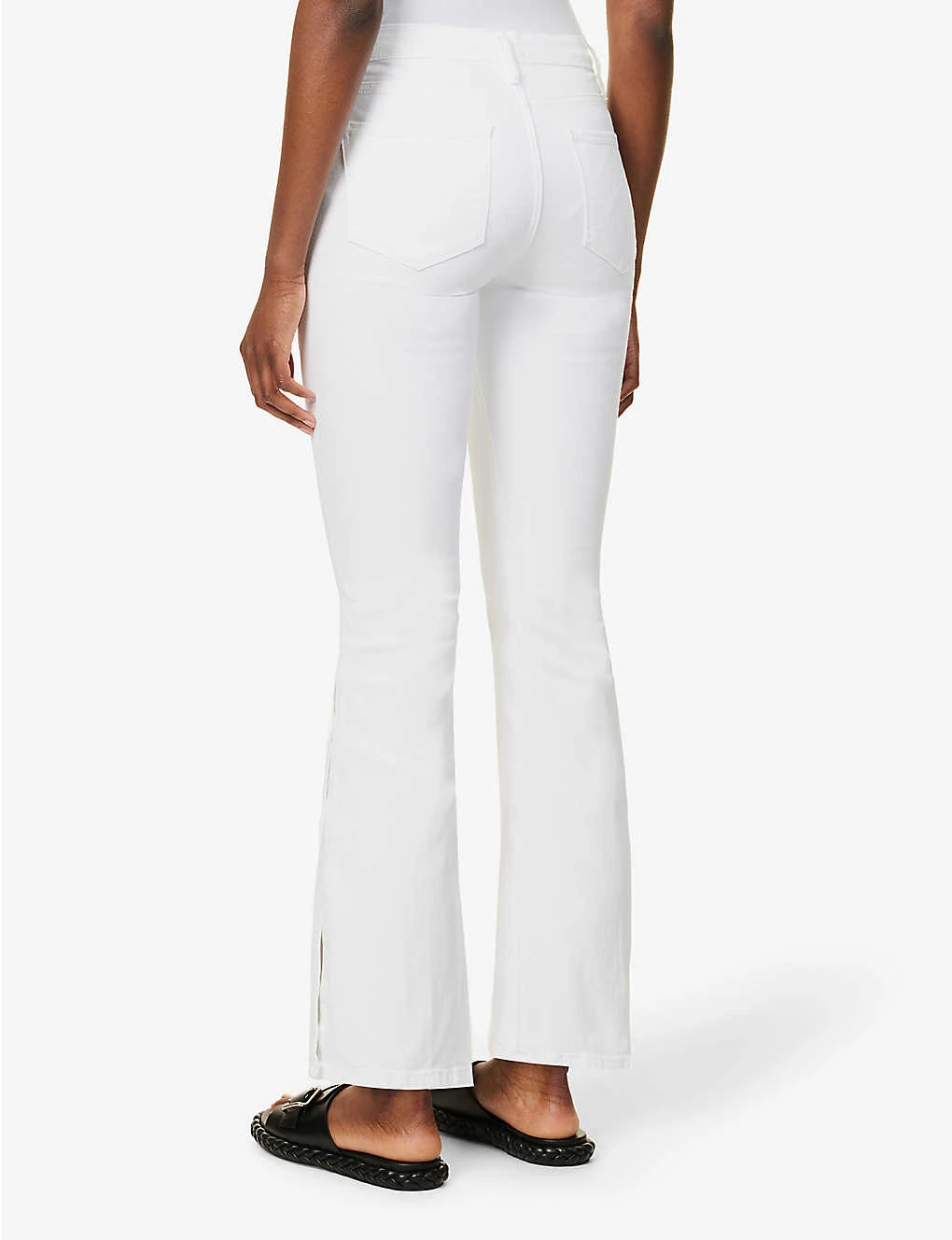 - Regular fit, mid-rise, flared leg, belt loops, five pockets, branded hardware, split hems, partially lined