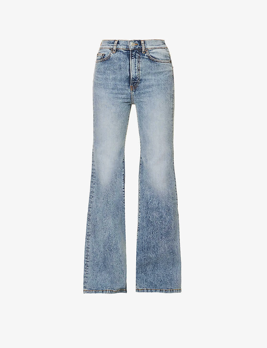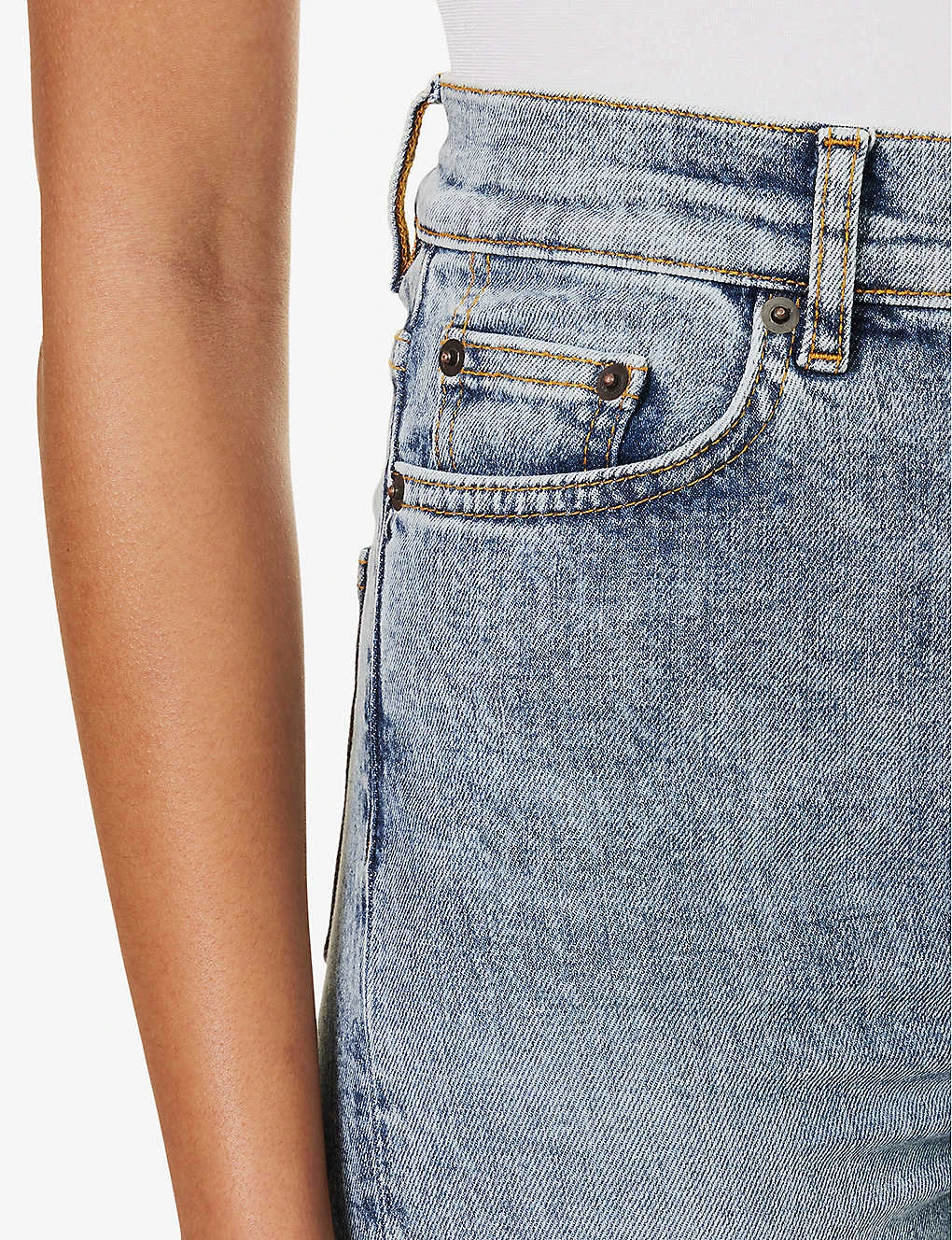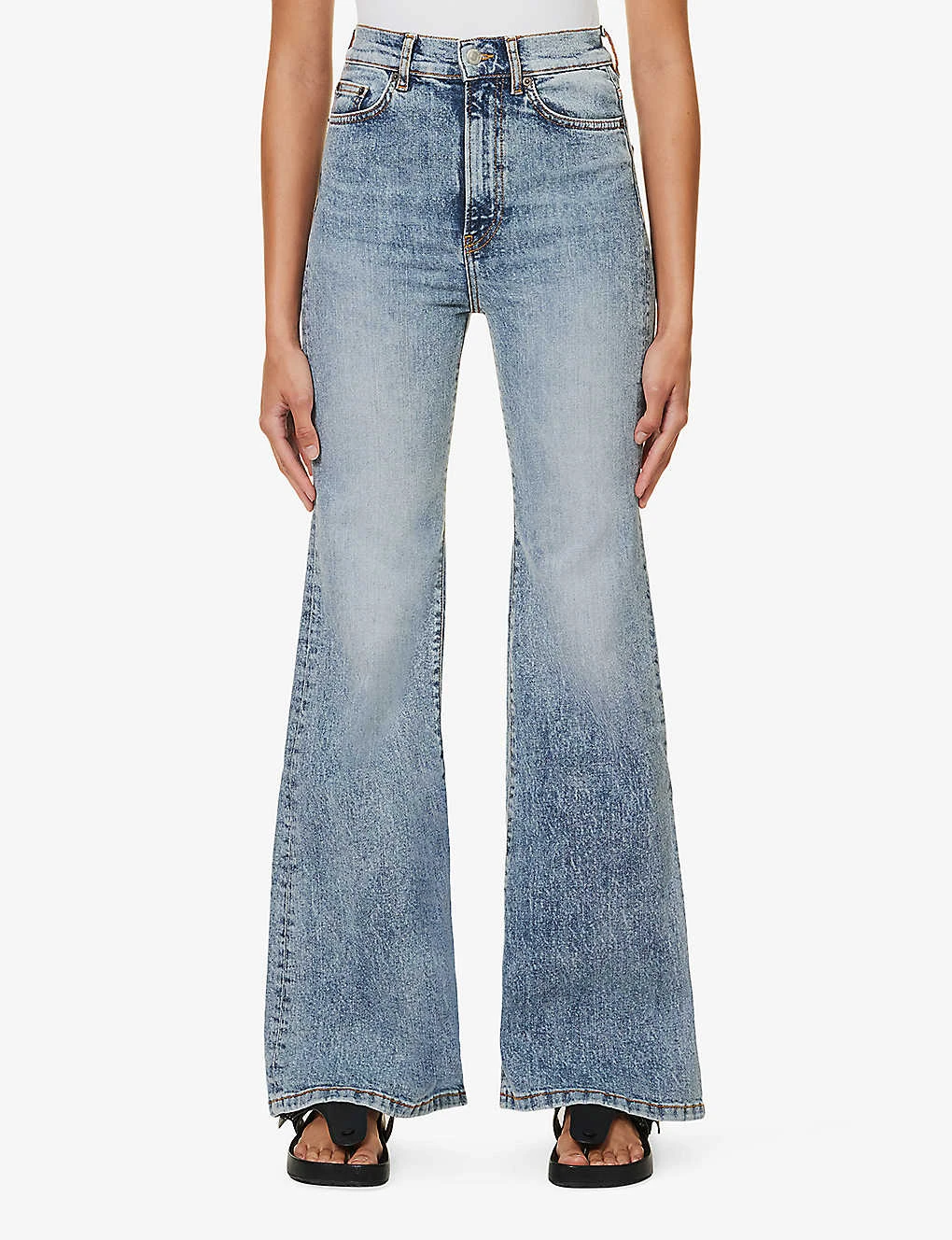 - Slim fit, high rise, wide leg, structured waistband, belt loops, five pockets, contrast stitching, brand patch at back, faded wash, silver-toned hardware