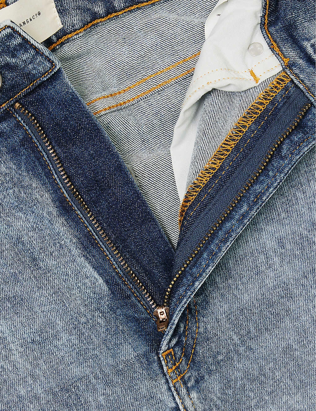 - Exposed button and concealed zip-fly fastening at front