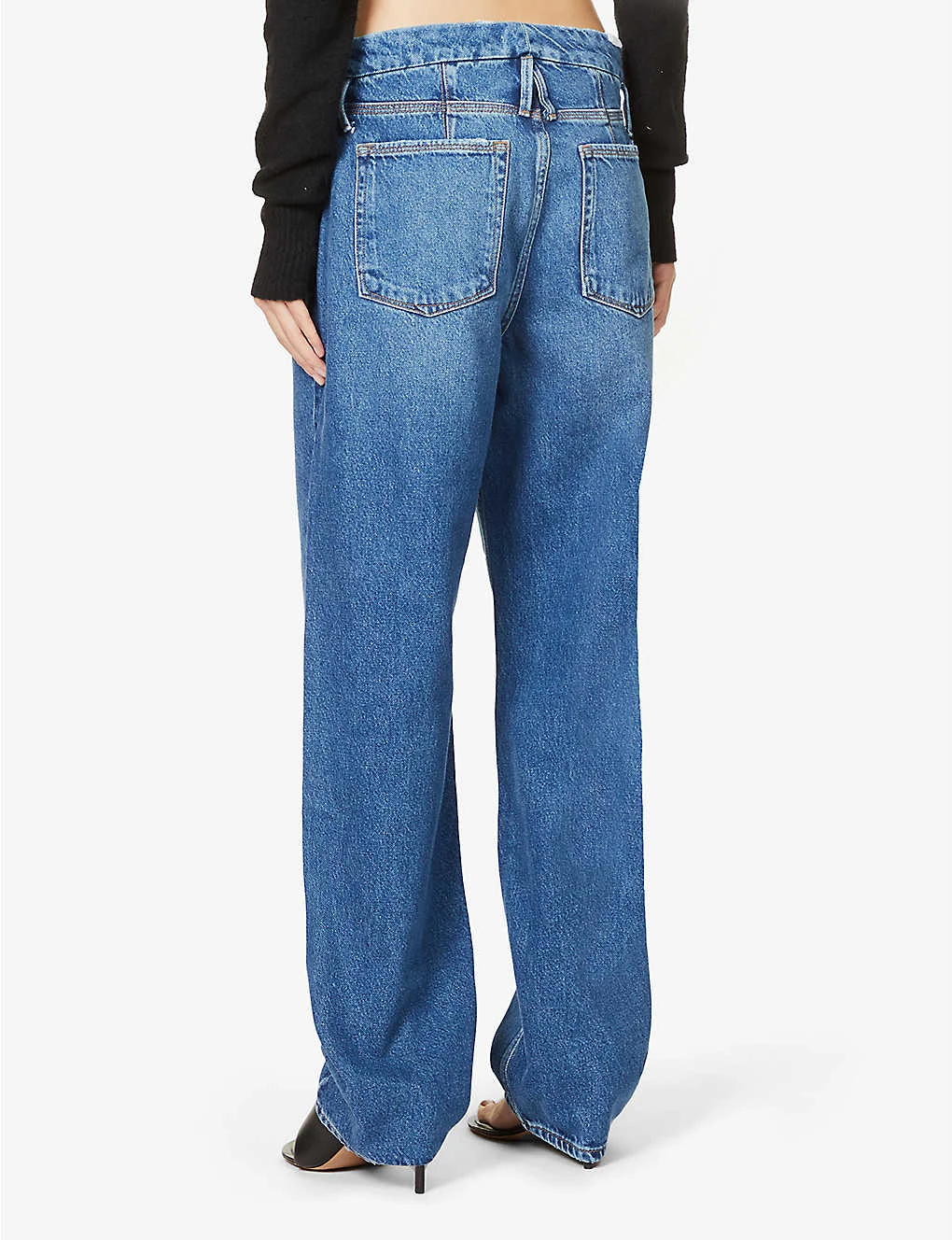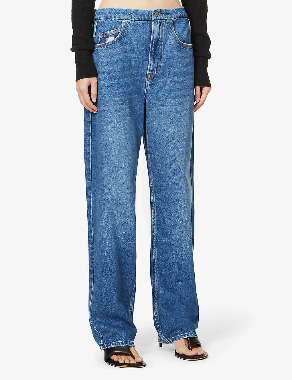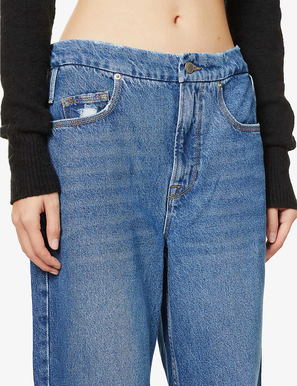 - Regular fit, high rise, relaxed straight leg, belt loops, five pockets, silver-toned hardware, contrast stitching, whiskering, V-shaped yoke at back, all-over faded wash