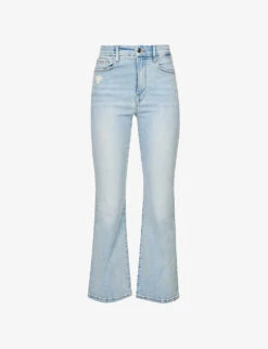 - Regular fit, mid-rise, cropped leg, belt loops, five pockets, faded wash, distressed, flared cuffs