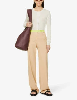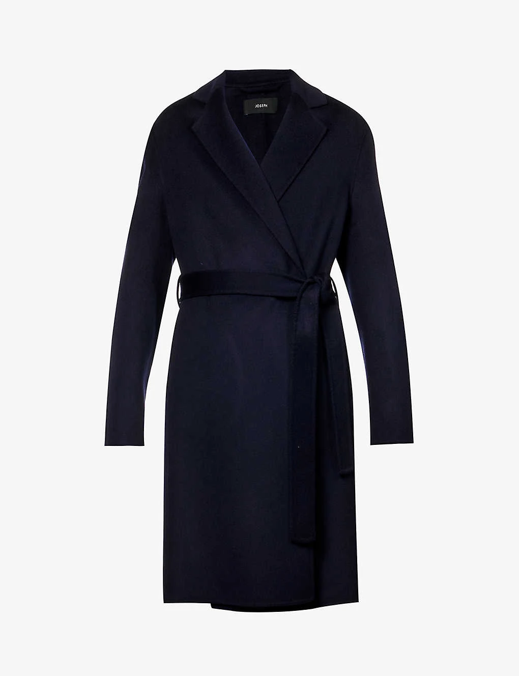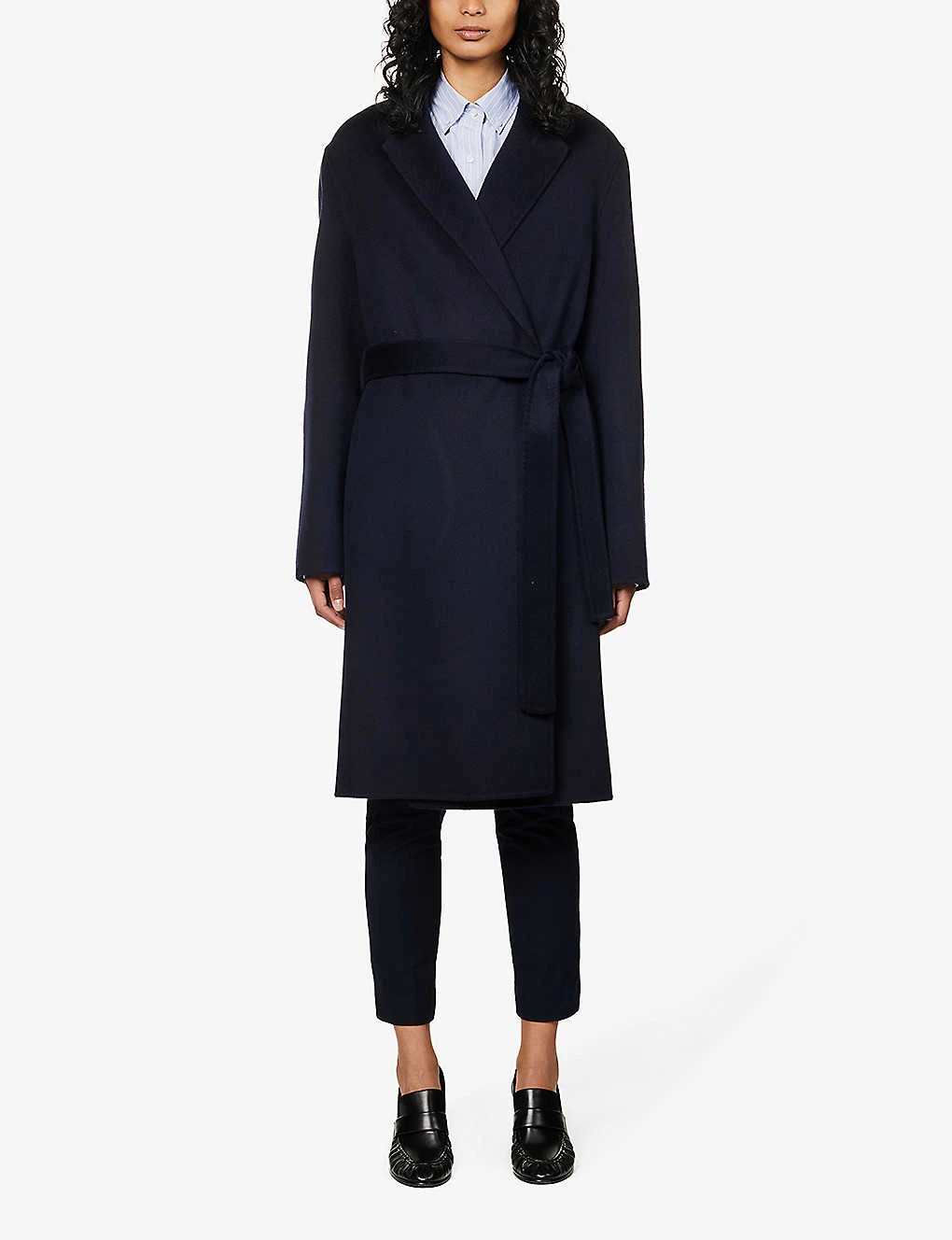 Long sleeves, seam pockets at sides, self-tie belt at waist, belted loops, exposed button fastenings at front