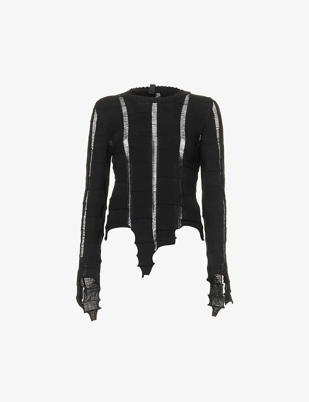 - Regular fit, round neckline, long sleeves, asymmetric sleeve hems, all-over textured grid pattern, fine knit texture, raw hem