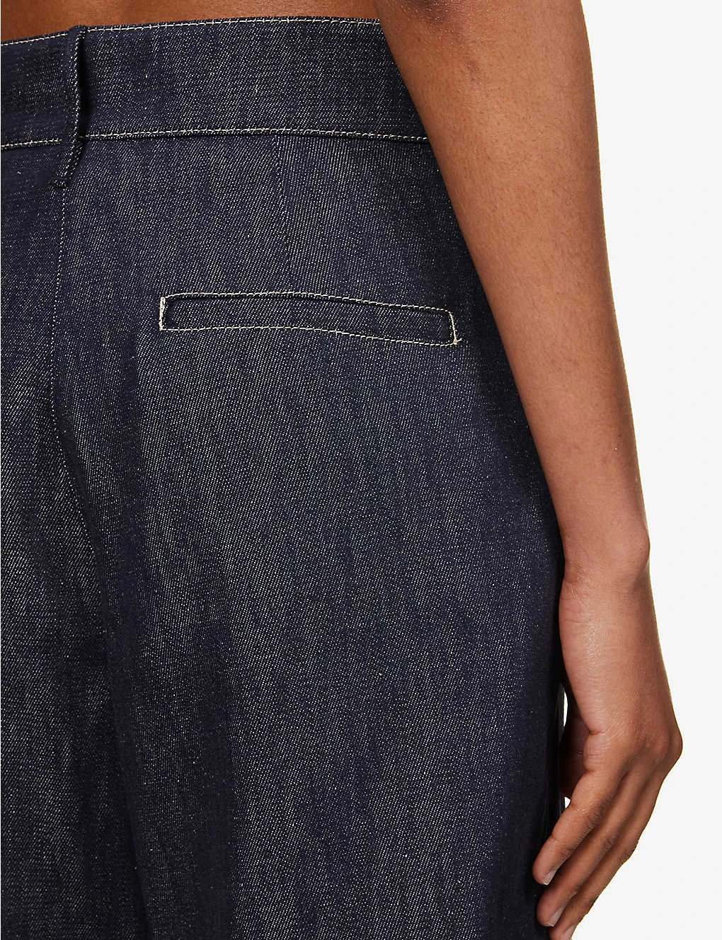 - Regular fit, mid-rise, wide leg, structured waistband with belt loops, darts at back, contrast stitching, mid-wash