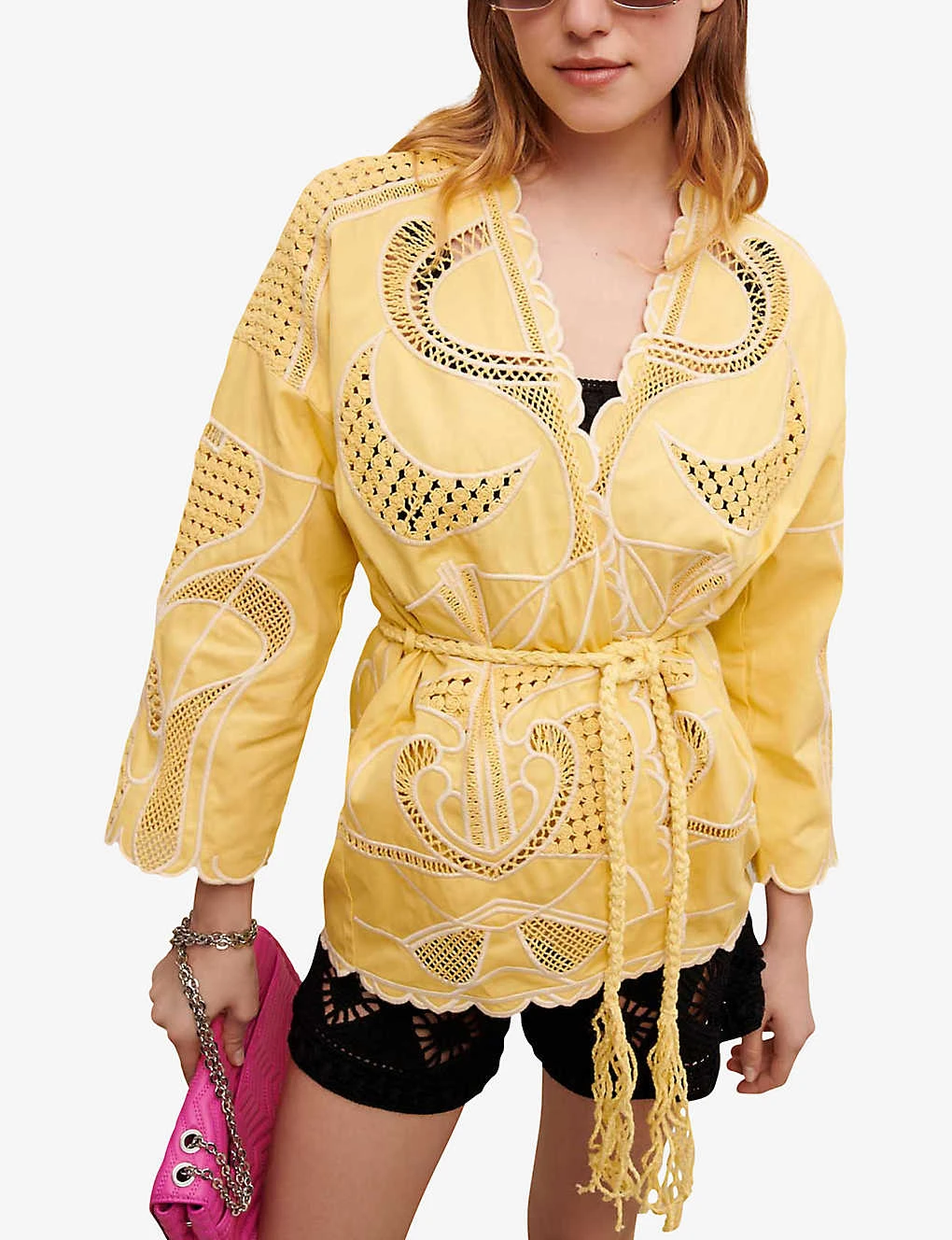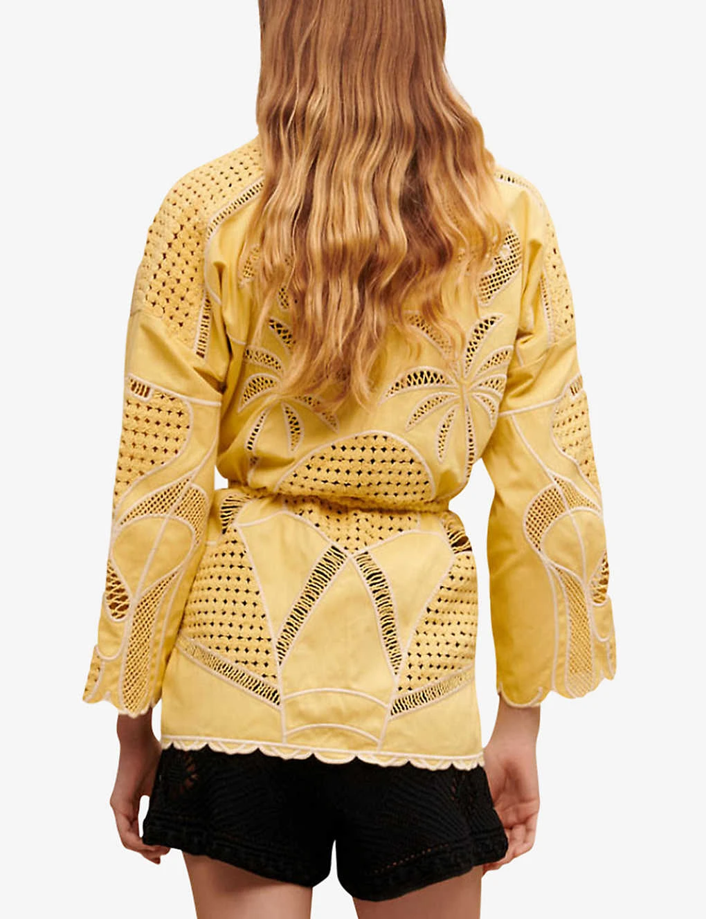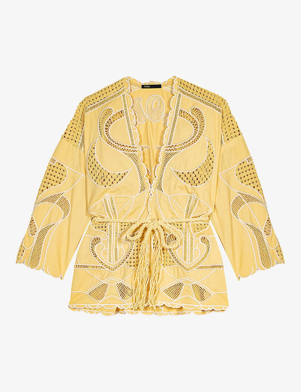 - V-neck, long sleeves, scalloped cuffs and hem, removeable tasselled toggle fastening, all-over crochet-panels