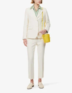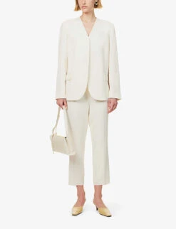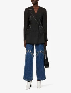 - Boxy fit, single-breasted, collar, notch lapel, long sleeves, one patch pocket, two welt pockets, contrast stitching, fully lined