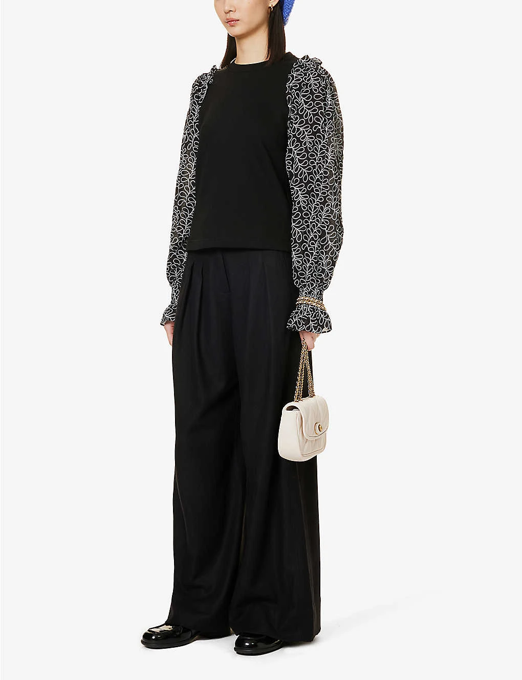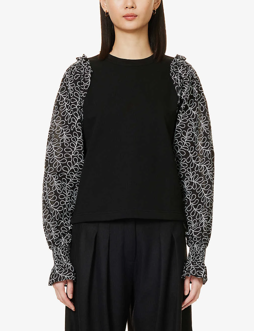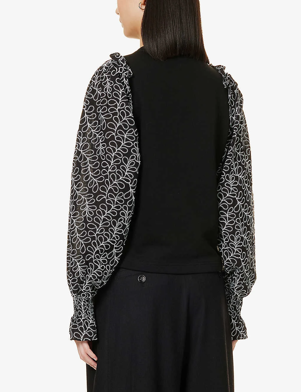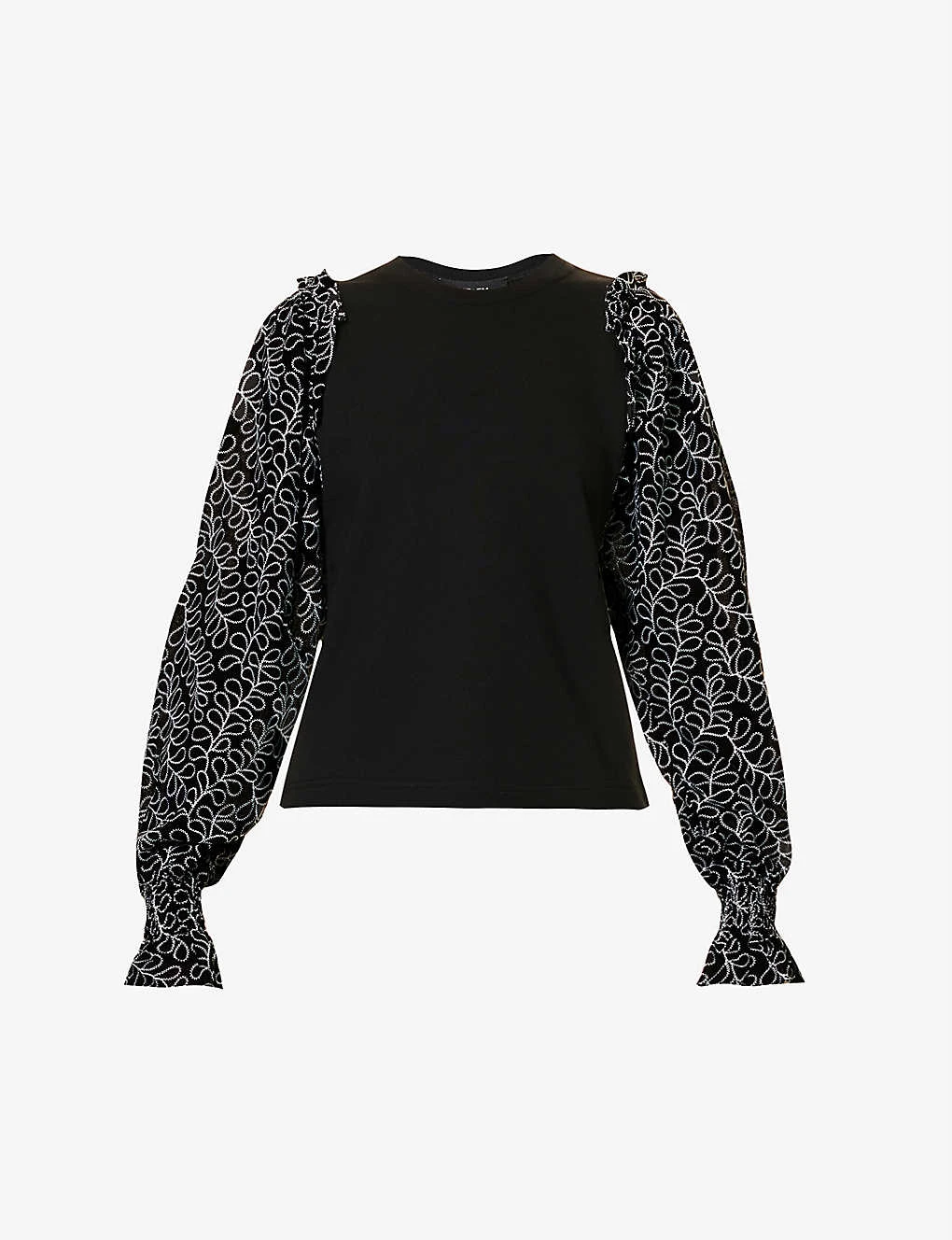 - Regular fit, round neck, ribbed trim at neck, contrast long puff sleeves, all-over contrast embroidery at sleeves, elasticated cuffs, frilled trims