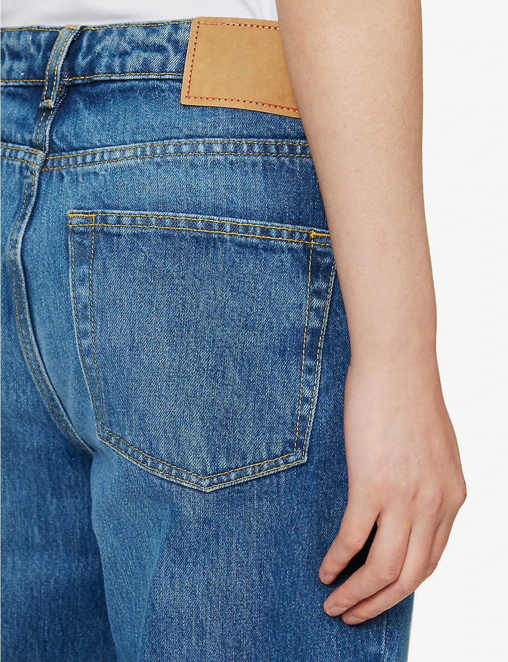 - Regular fit, mid-rise, straight leg, structured waistband with belt loops, five pockets, brand patch at back, curved yoke at back, mid-wash, contrast stitching, silver-toned hardware