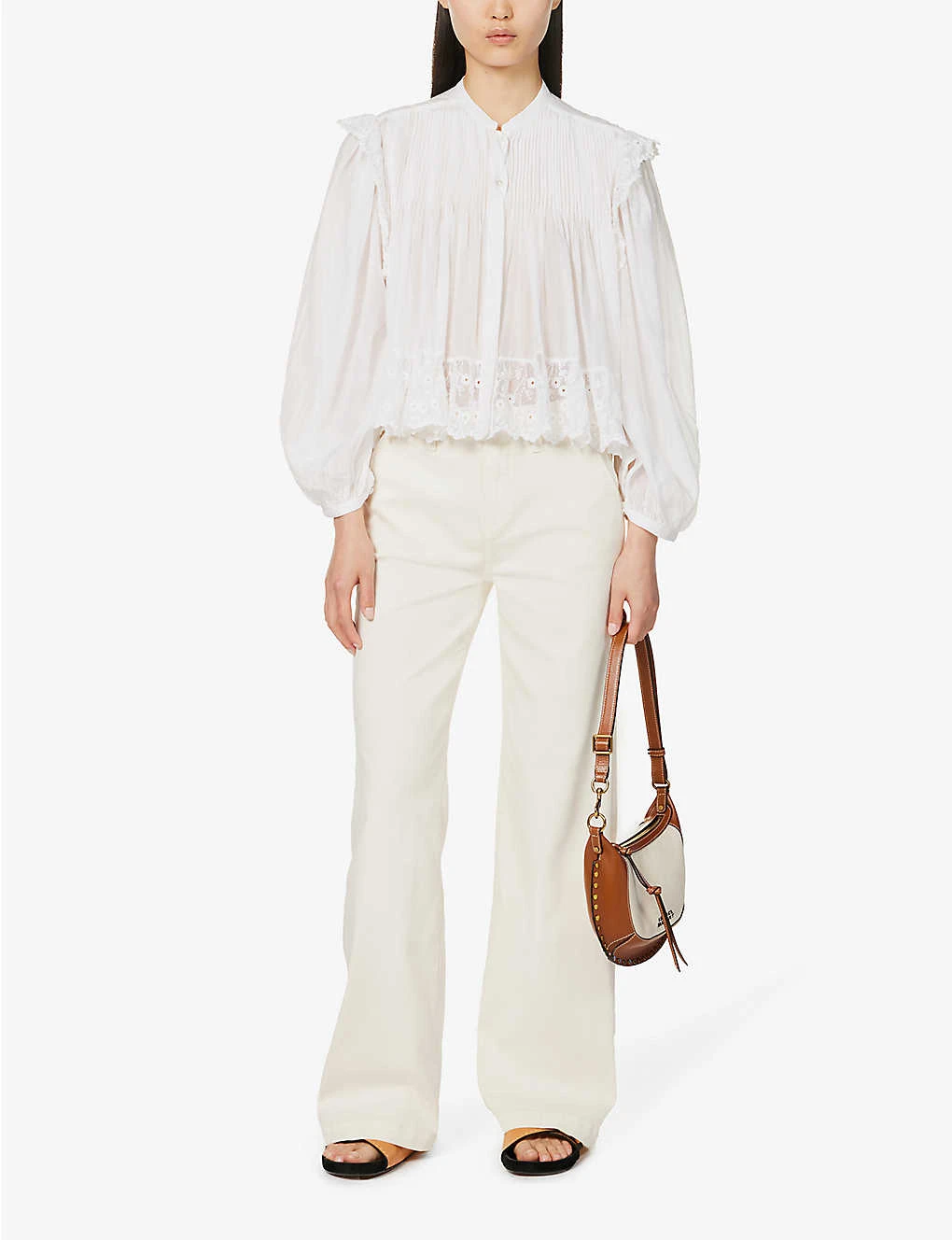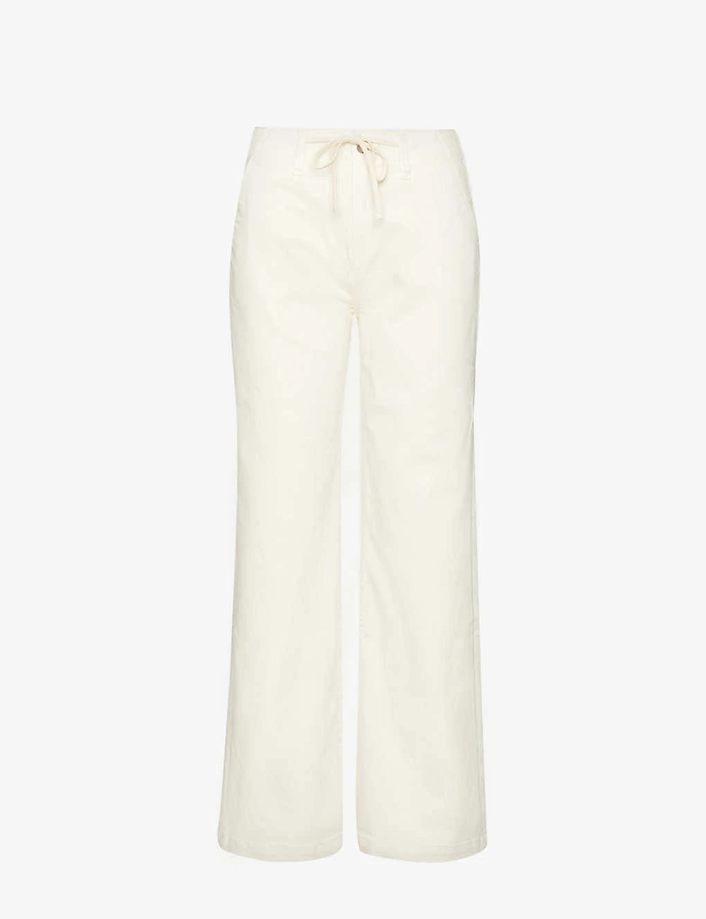 - Regular fit, mid-rise, wide leg, structured waistband with belt loops, two slip pockets at front, brand patch at back, darts at back, two patch pockets at back, branded silver-toned hardware