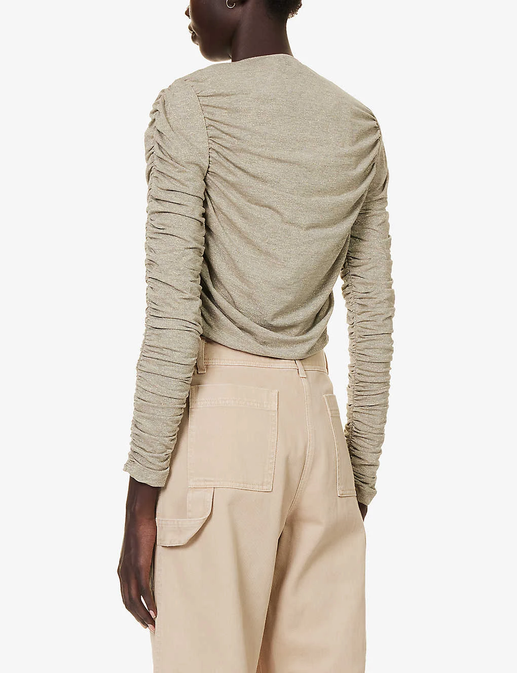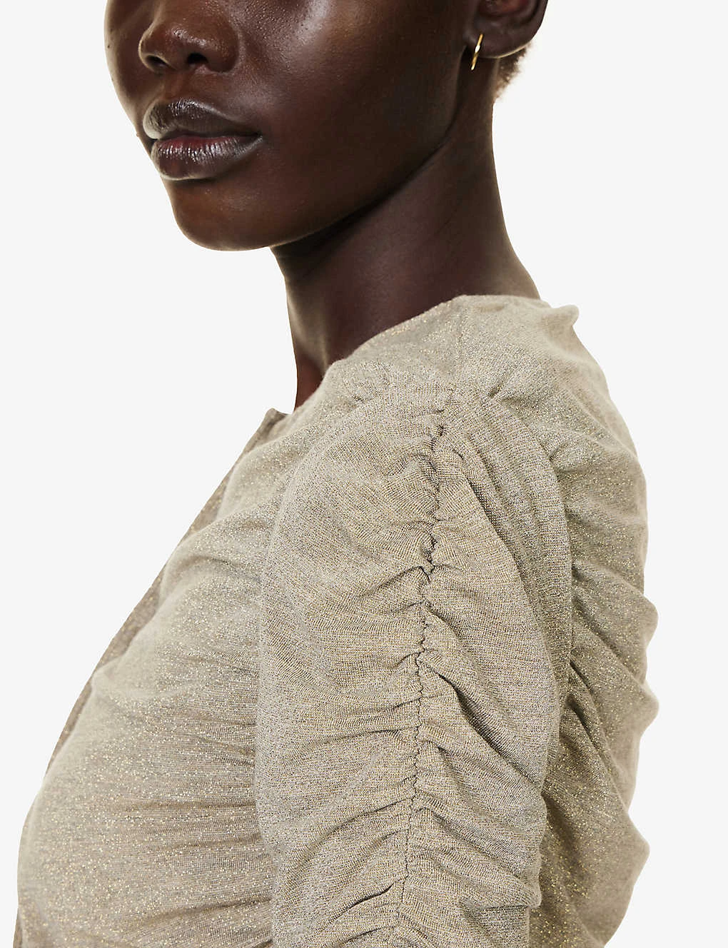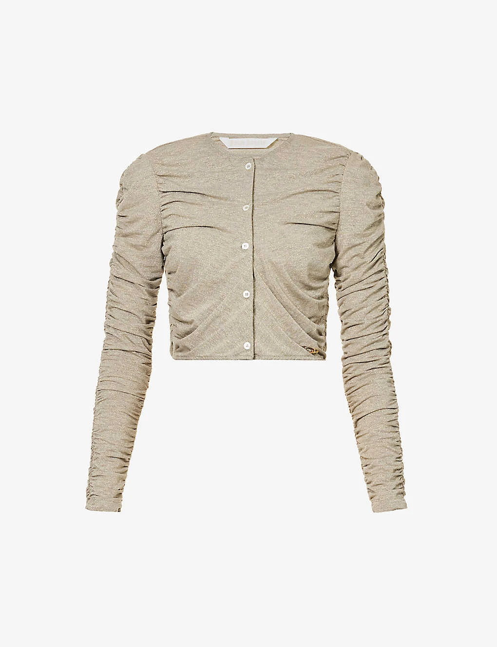- Slim fit, round neck, long sleeves, gold-toned brand charm at front, ruched design, metallic thread weave, cropped, branded pearlescent buttons
