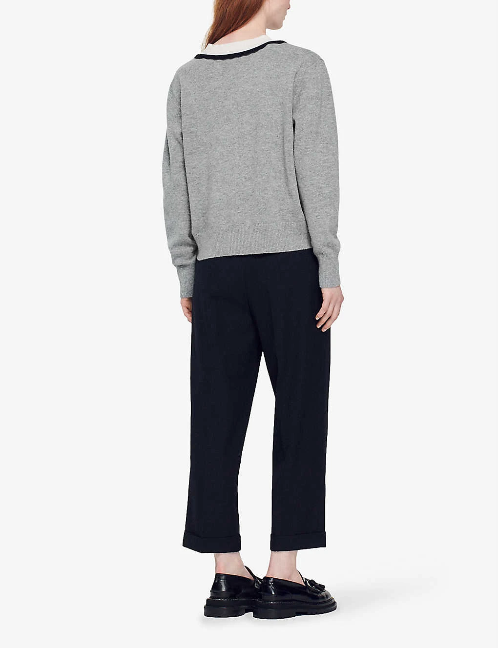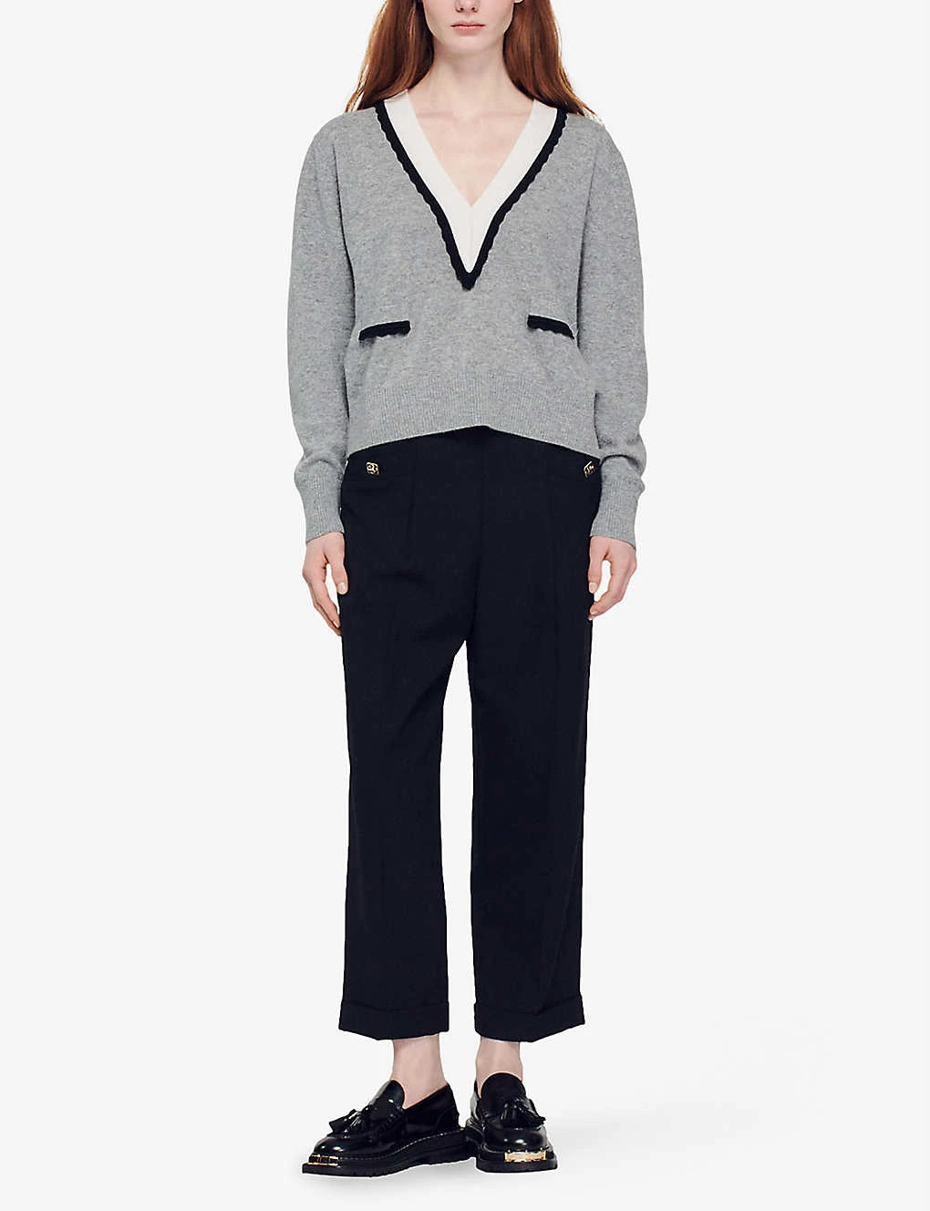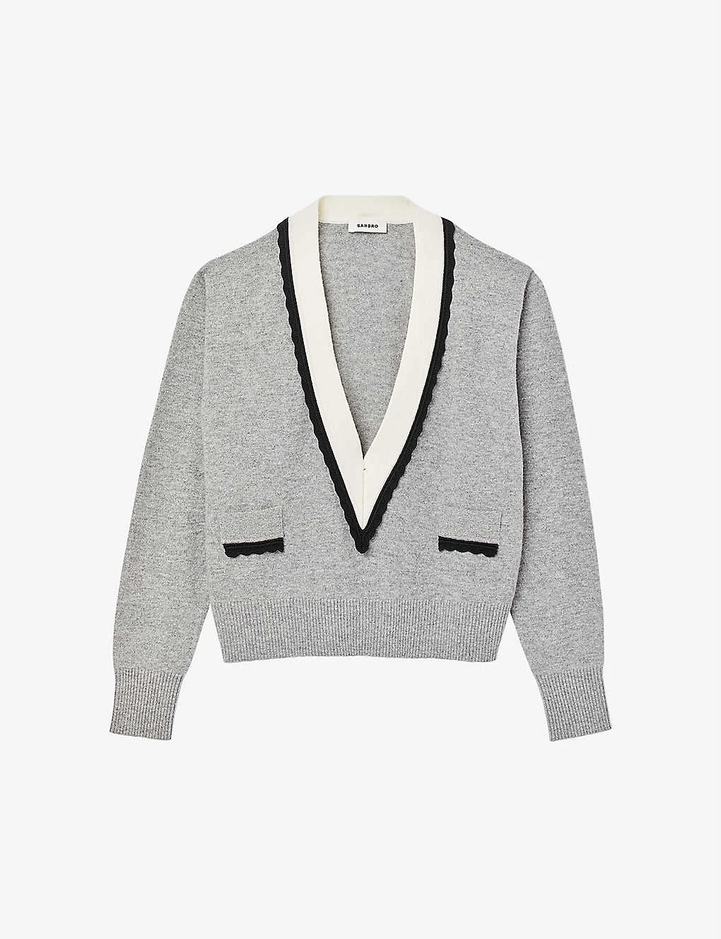 - Deep contrasting V-neck, long sleeves, ribbed hem and cuffs, contrast faux-pocket details at the waist