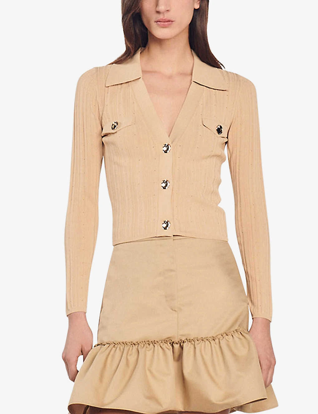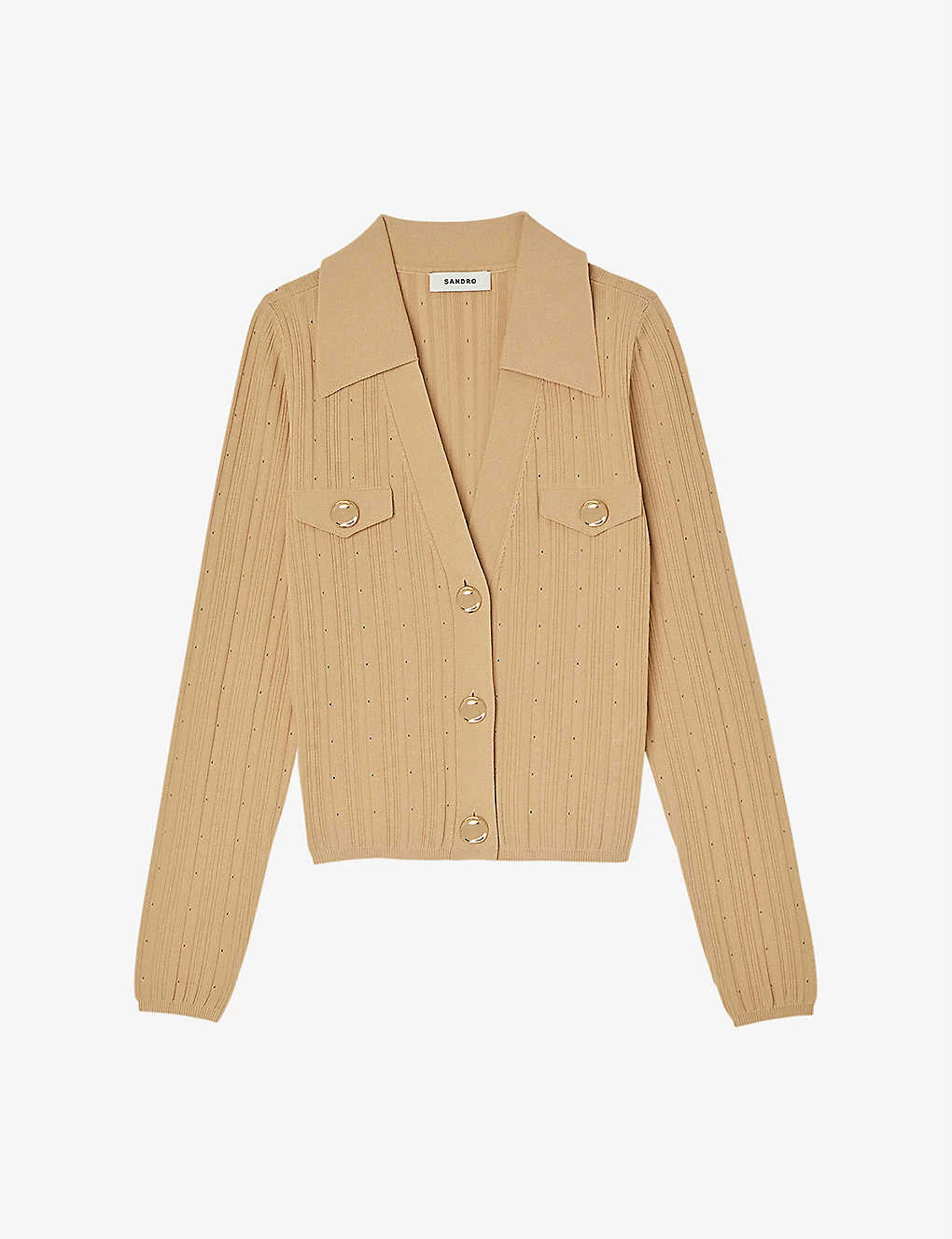 - Slim fit, long sleeves, V neck, open collar, ribbed knit, cropped length, two chest flap pockets, gold-tone logo-debossed buttons