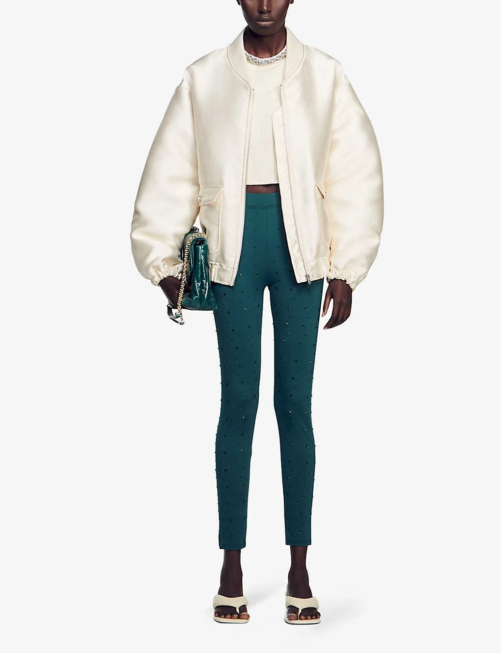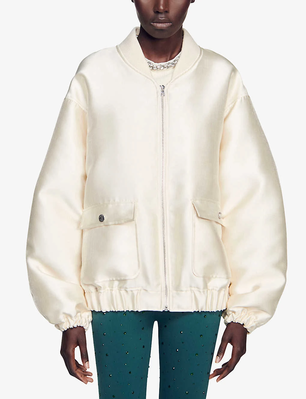 - Boxy fit, satin texture, ribbed collar, dropped shoulders, long sleeves, elasticated cuffs and hem, two flap pockets at front, branded buttons, silver-toned hardware, fully lined