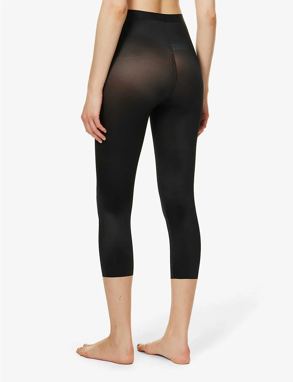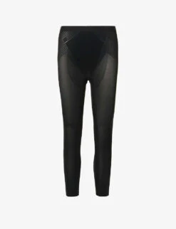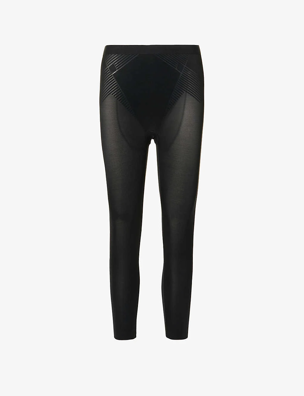 - Slim-fit, high-rise, elasticated waistband, all-over satin texture