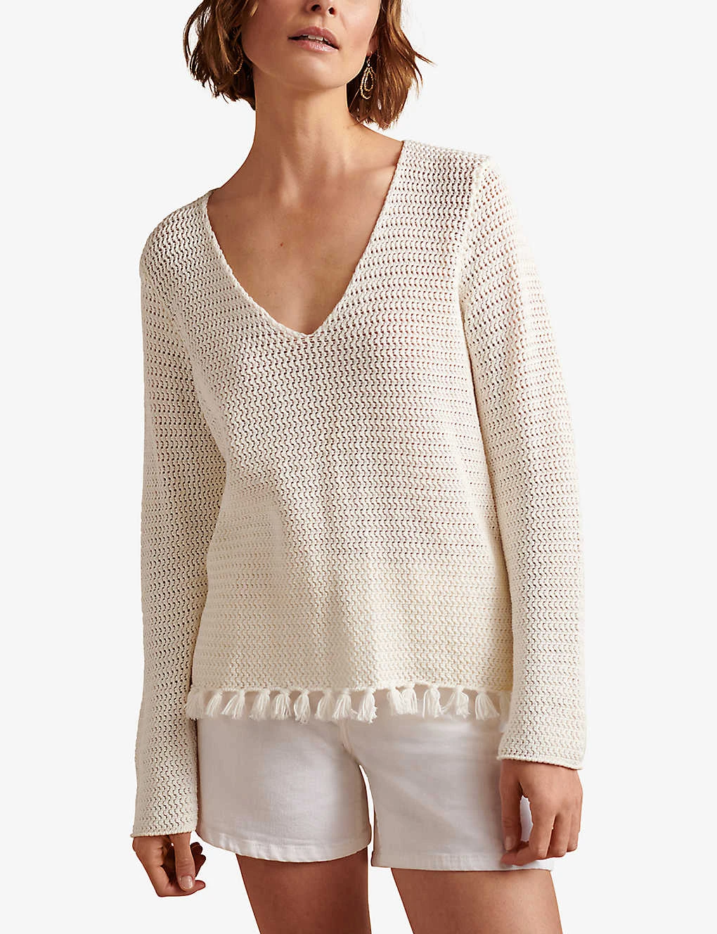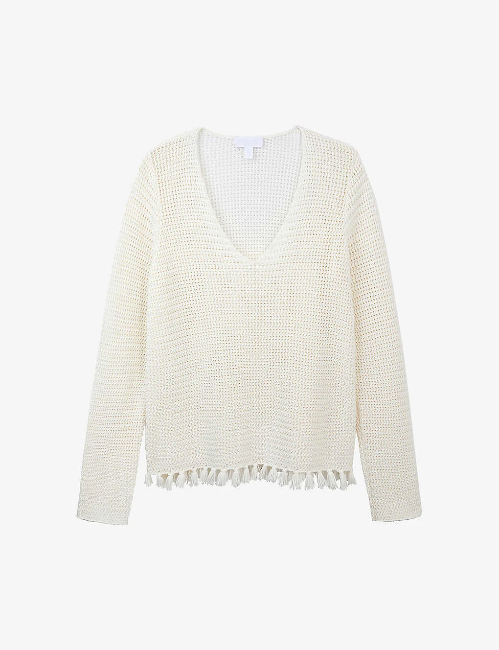 - V-neck, long sleeves, all-over crochet texture, tassel hem