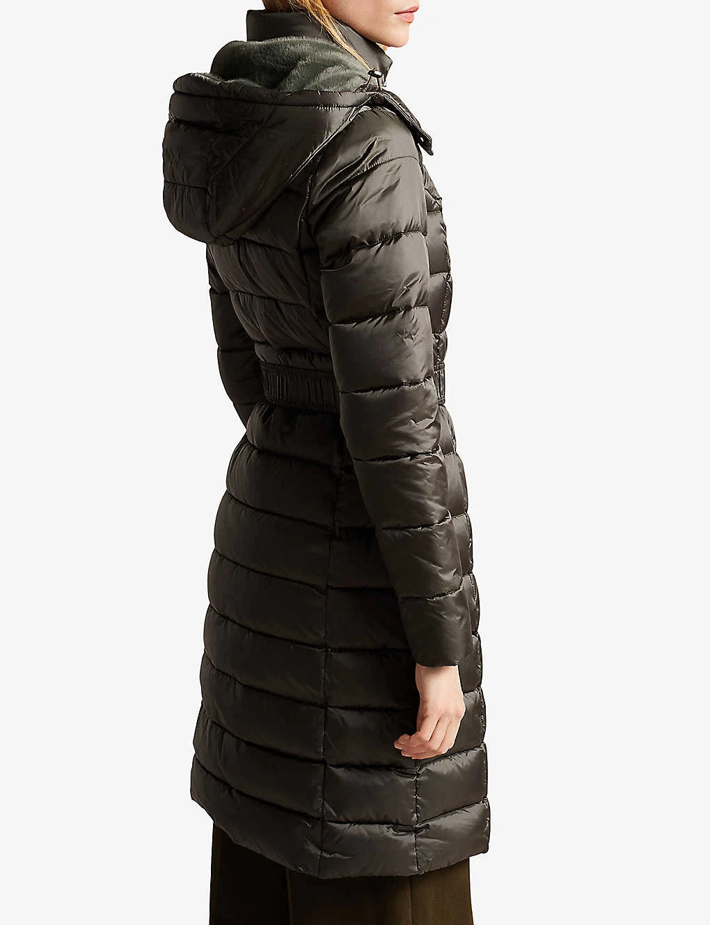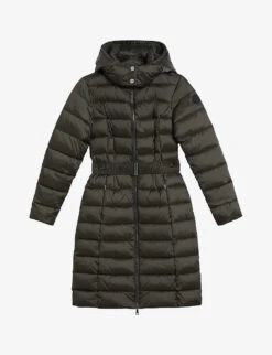 - Slim fit, funnel neck, detachable faux fur-trimmed hood, rubberised logo patch at arm, zipped pockets at sides, removable waist-belt, quilted design
