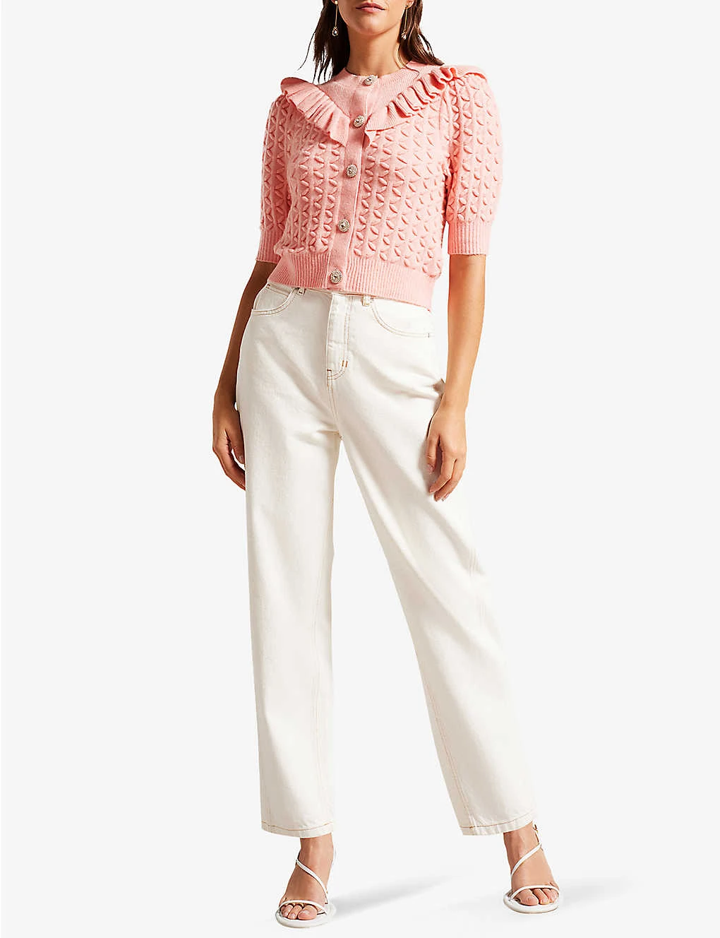 - Round neck, ruffle trim V-panel at front, three-quarter-length sleeves, crystal-embellished buttons at front, all-over textured knit, ribbed trims
