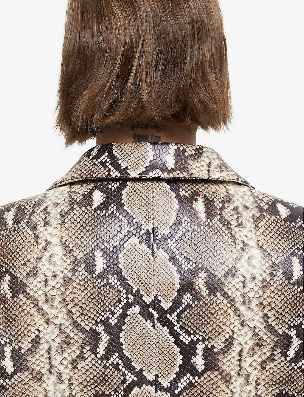 - Straight cut, long sleeves, notched lapels, all-over python effect, single-breasted design, fully lined, chest welt pocket, two side flap pockets, buttoned cuffs