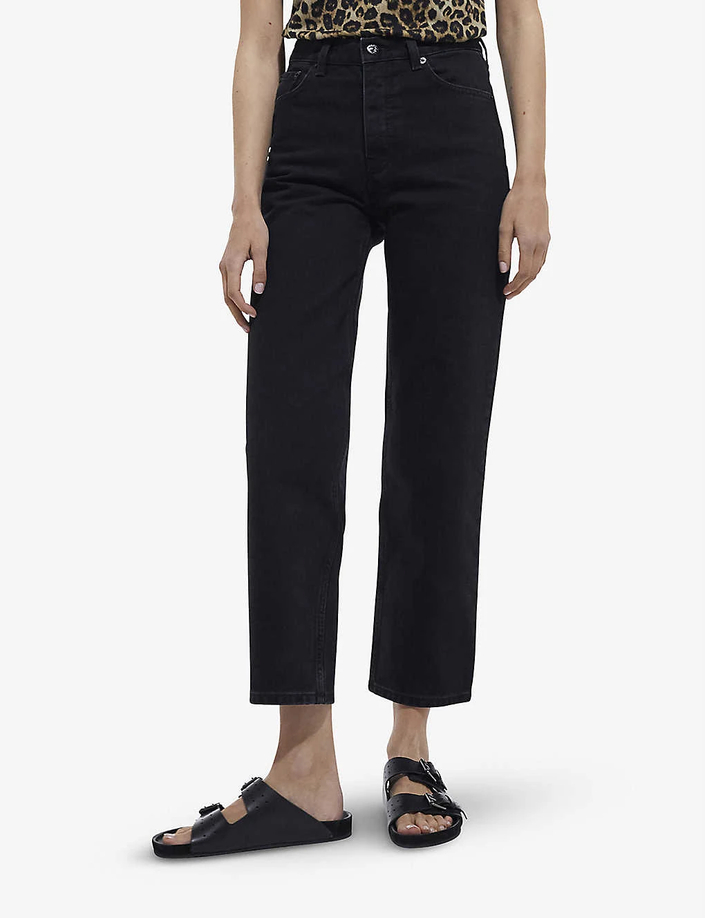 - Straight leg, high rise, cropped length, faded effect, belt loops, five pockets, front button fastening