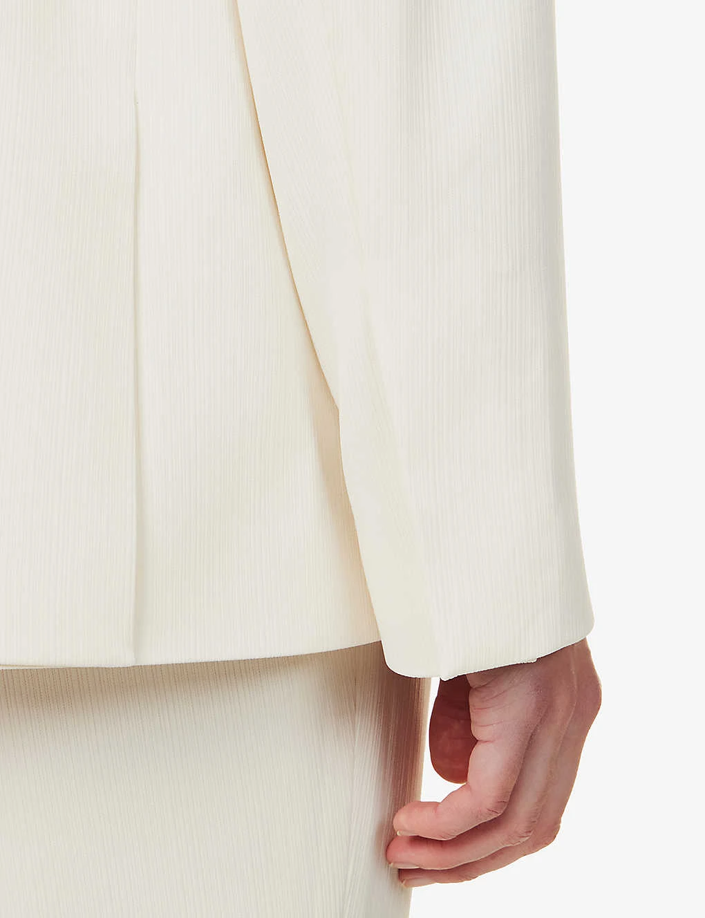 - Regular-fit, V-neck, long sleeves, darts at front, two flap pockets at front, all-over crinkle texture, double-vent at back, fully lined