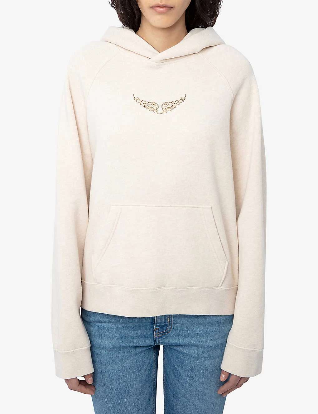 - Relaxed fit, hooded, long sleeves, kangaroo pocket at front, eembellished diamanté wings-motif at front, ribbed trims